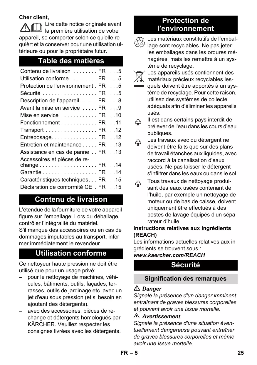Contenu de livraison L'étendue de la fourniture de votre appareil figure sur l'emballage. Lors du déballage, contrôler l’intégralité du matériel. S'il manque des accessoires ou en cas de dommages imputables au transport, informer immédiatement le revendeur. Utilisation conforme Ce nettoyeur haute pression ne doit être utilisé que pour un usage privé: – pour le nettoyage de machines, véhicules, bâtiments, outils, façades, terrasses, outils de jardinage etc. avec un jet d'eau sous pression (et si besoin en ajoutant des détergents). – avec des accessoires, pièces de rechange et détergents homologués par KÄRCHER. Veuillez respecter les consignes livrées avec les détergents. Protection de l’environnement Les matériaux constitutifs de l’emballage sont recyclables. Ne pas jeter les emballages dans les ordures ménagères, mais les remettre à un système de recyclage. Les appareils usés contiennent des matériaux précieux recyclables lesquels doivent être apportés à un système de recyclage. Pour cette raison, utilisez des systèmes de collecte adéquats afin d'éliminer les appareils usés. Il est dans certains pays interdit de prélever de l'eau dans les cours d'eau publiques. Les travaux avec du détergent ne doivent être faits que sur des plans de travail étanches aux liquides, avec raccord à la canalisation d'eaux usées. Ne pas laisser le détergent s'infiltrer dans les eaux ou dans le sol. Tous travaux de nettoyage produisant des eaux usées contenant de l’huile, par exemple un nettoyage de moteur ou de bas de caisse, doivent uniquement être effectués à des postes de lavage équipés d’un séparateur d’huile. Instructions relatives aux ingrédients (REACH) Les informations actuelles relatives aux ingrédients se trouvent sous : www.kaercher.com/REACH Sécurité Signification des remarques Danger Signale la présence d'un danger imminent entraînant de graves blessures corporelles et pouvant avoir une issue mortelle. 몇 Avertissement Signale la présence d'une situation éventuellement dangereuse pouvant entraîner de graves blessures corporelles et même avoir une issue mortelle. FR – 5