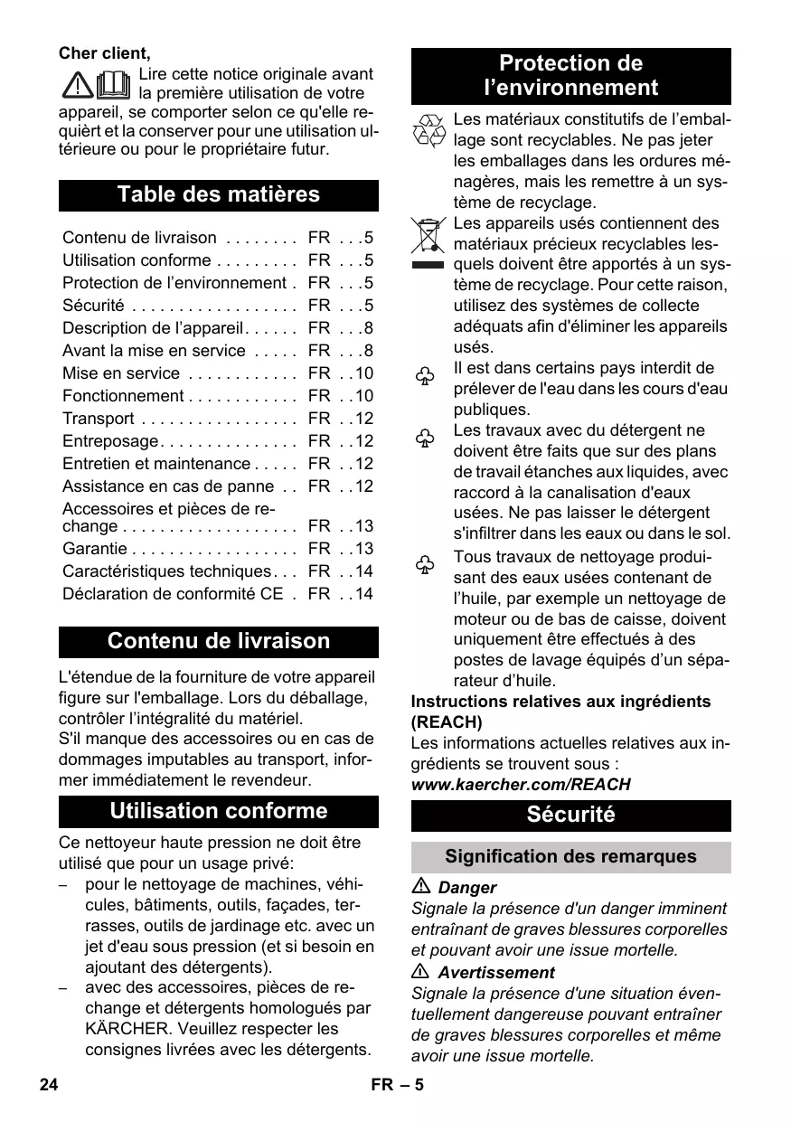 – pour le nettoyage de machines, véhicules, bâtiments, outils, façades, terrasses, outils de jardinage etc. avec un jet d'eau sous pression (et si besoin en ajoutant des détergents). – avec des accessoires, pièces de rechange et détergents homologués par KÄRCHER. Veuillez respecter les consignes livrées avec les détergents. 24