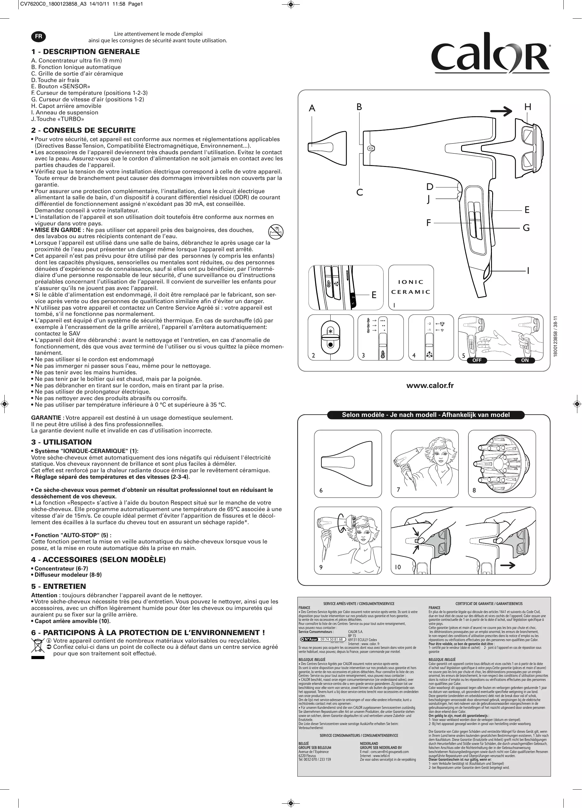 En plus de la garantie légale qui découle des articles 104-105 et 106 du code civil, due en tout état de cause pour les défauts et vices cachés de l'article, Calor assure une garantie contractuelle à partir de la date d'achat, sauf législation spécifique à chaque pays. Cette garantie (pièces et main d'oeuvre) ne couvre pas les bris par chute et choc, les détériorations provoquées par un emploi anormal, les erreurs de branchement, le non-respect des conditions d'utilisation prescrites dans la notice d'emploi ou les réparations ou vérifications effectuées par des personnes non qualifiées par Calor. Pour être valable, ce bon de garantie doit être : 1- certifié par le vendeur (date et cachet) ; 2- joint à l'appareil en cas de réparation sous