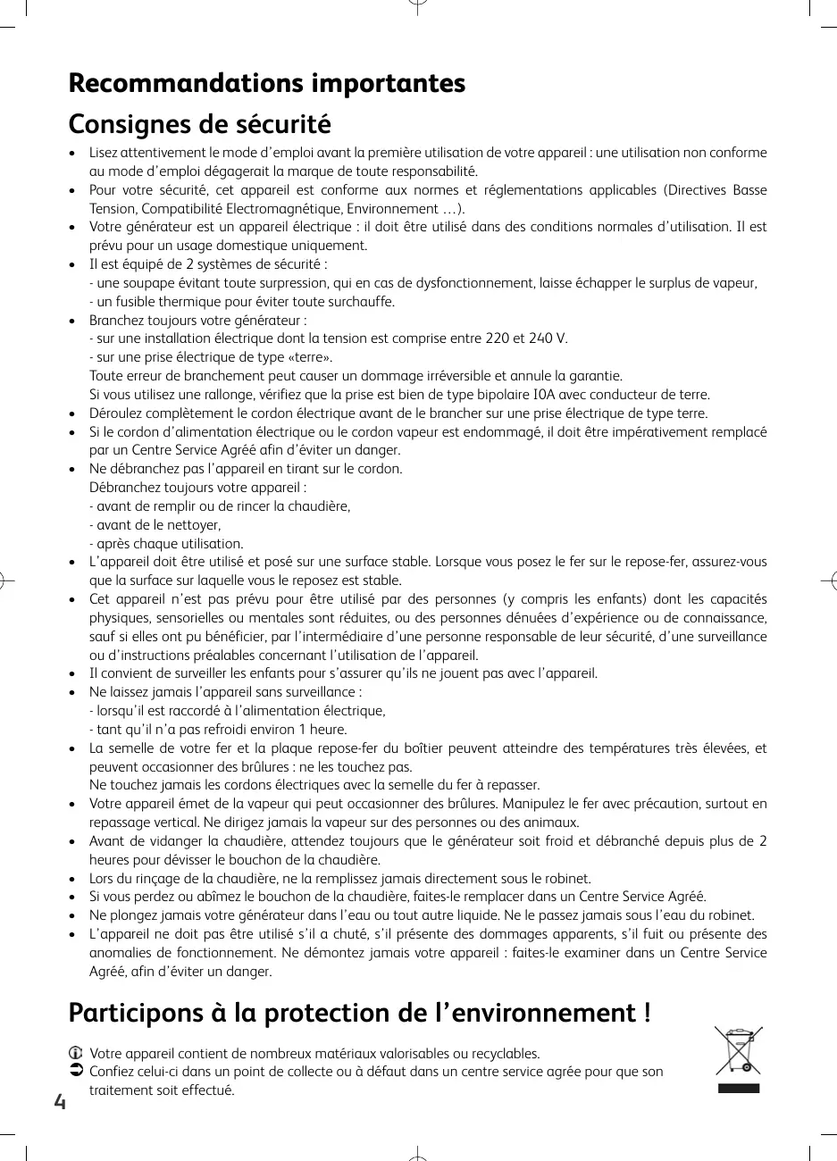 - L’appareil ne doit pas être utilisé s’il a chuté, s’il présente des dommages apparents, s’il fuit ou présente des anomalies de fonctionnement. Ne démontez jamais votre appareil : faites-le examiner dans un Centre Service Agréé, afin d’éviter un danger. Participons à la protection de l’environnement ! Votre appareil contient de nombreux matériaux valorisables ou recyclables. Confiez celui-ci dans un point de collecte ou à défaut dans un centre service agrée pour que son