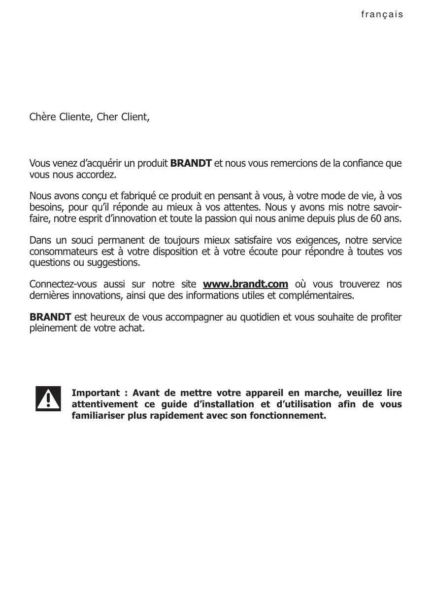 Pour en savoir plus sur nos produits ou nous contacter, vous pouvez: > consulter notre site : www.brandt.com > nous écrire à l’adresse postale suivante : Service Consommateurs BRANDT 5 avenue des Béthunes