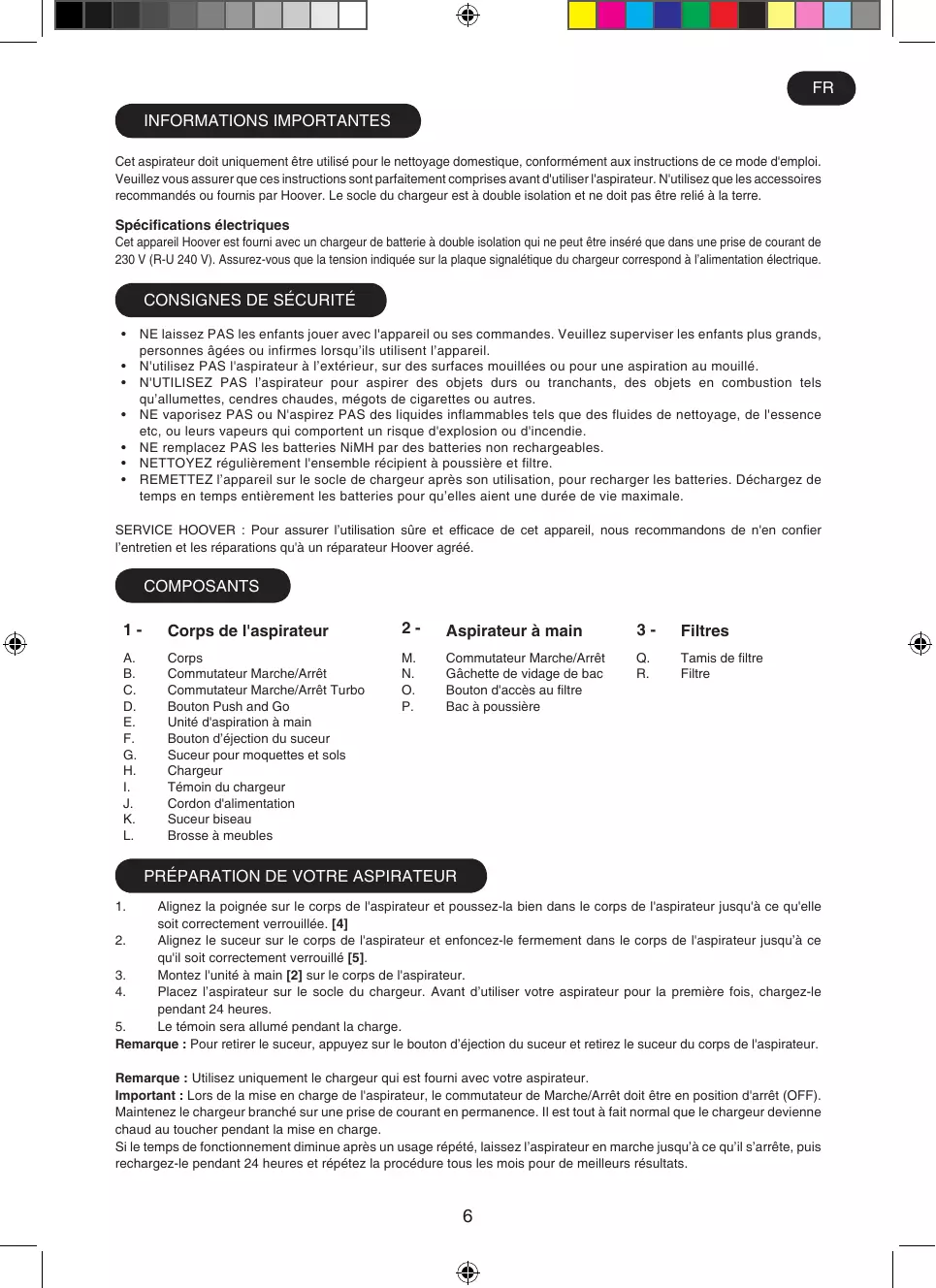 FR informations importantes Cet aspirateur doit uniquement être utilisé pour le nettoyage domestique, conformément aux instructions de ce mode d'emploi. Veuillez vous assurer que ces instructions sont parfaitement comprises avant d'utiliser l'aspirateur. N'utilisez que les accessoires recommandés ou fournis par Hoover. Le socle du chargeur est à double isolation et ne doit pas être relié à la terre.
