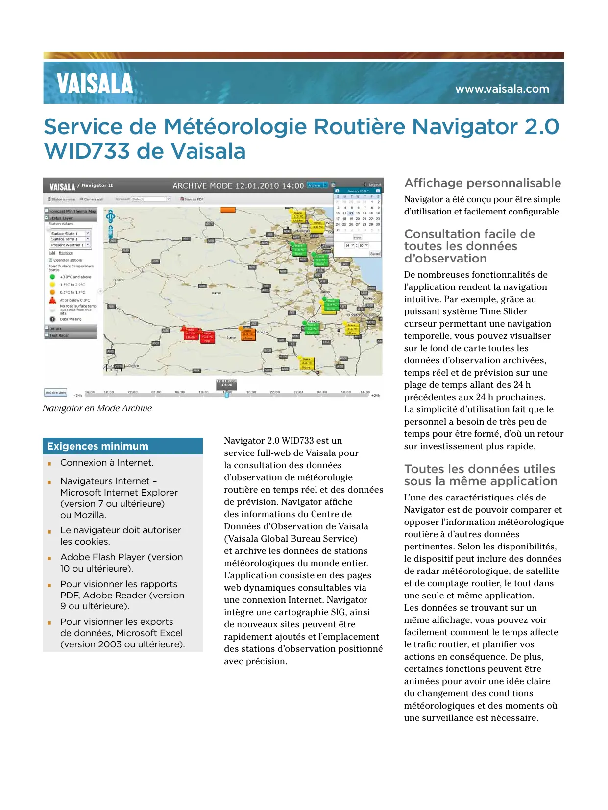 www.vaisala.com Service de Météorologie Routière Navigator 2.0 WID733 de Vaisala Affichage personnalisable Navigator a été conçu pour être simple d’utilisation et facilement configurable. Consultation facile de toutes les données d’observation Navigator en Mode Archive Exigences minimum