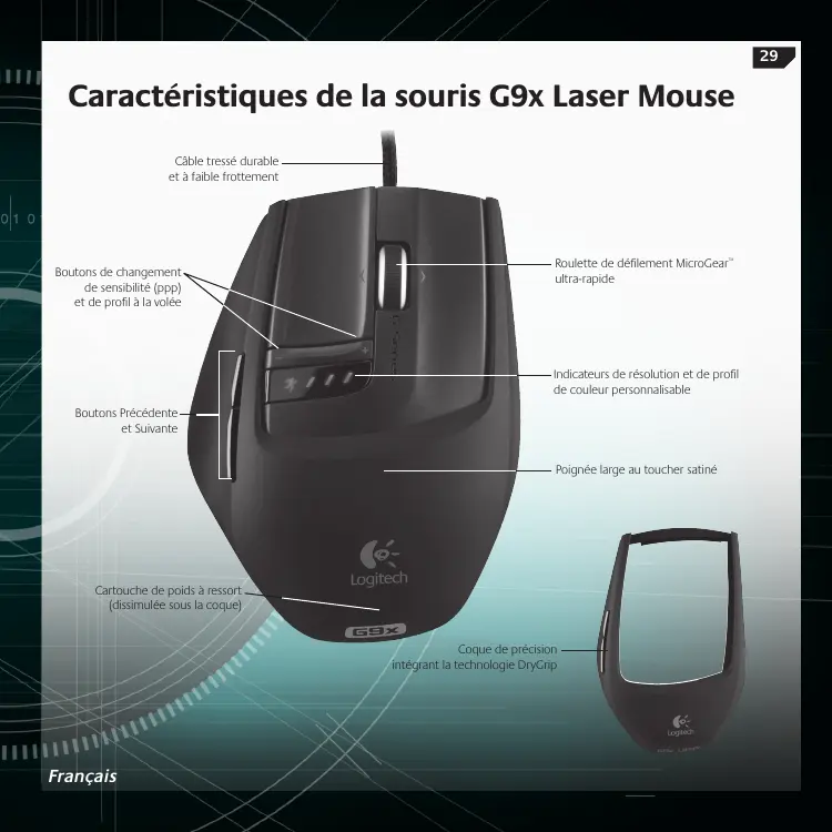 Caractéristiques de la souris G9x Laser Mouse Câble tressé durable et à faible frottement Boutons de changement de sensibilité (ppp) et de profil à la volée Roulette de défilement MicroGear™ ultra-rapide Indicateurs de résolution et de profil de couleur personnalisable Boutons Précédente et Suivante Poignée large au toucher satiné Cartouche de poids à ressort (dissimulée sous la coque) Coque de précision intégrant la technologie DryGrip Français