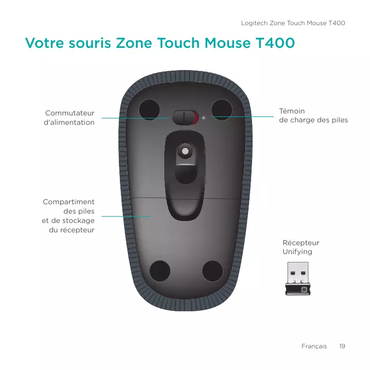 Français Votre souris Zone Touch Mouse T400 Commutateur d'alimentation Témoin de charge des piles Compartiment des piles et de stockage du récepteur Récepteur Unifying Français