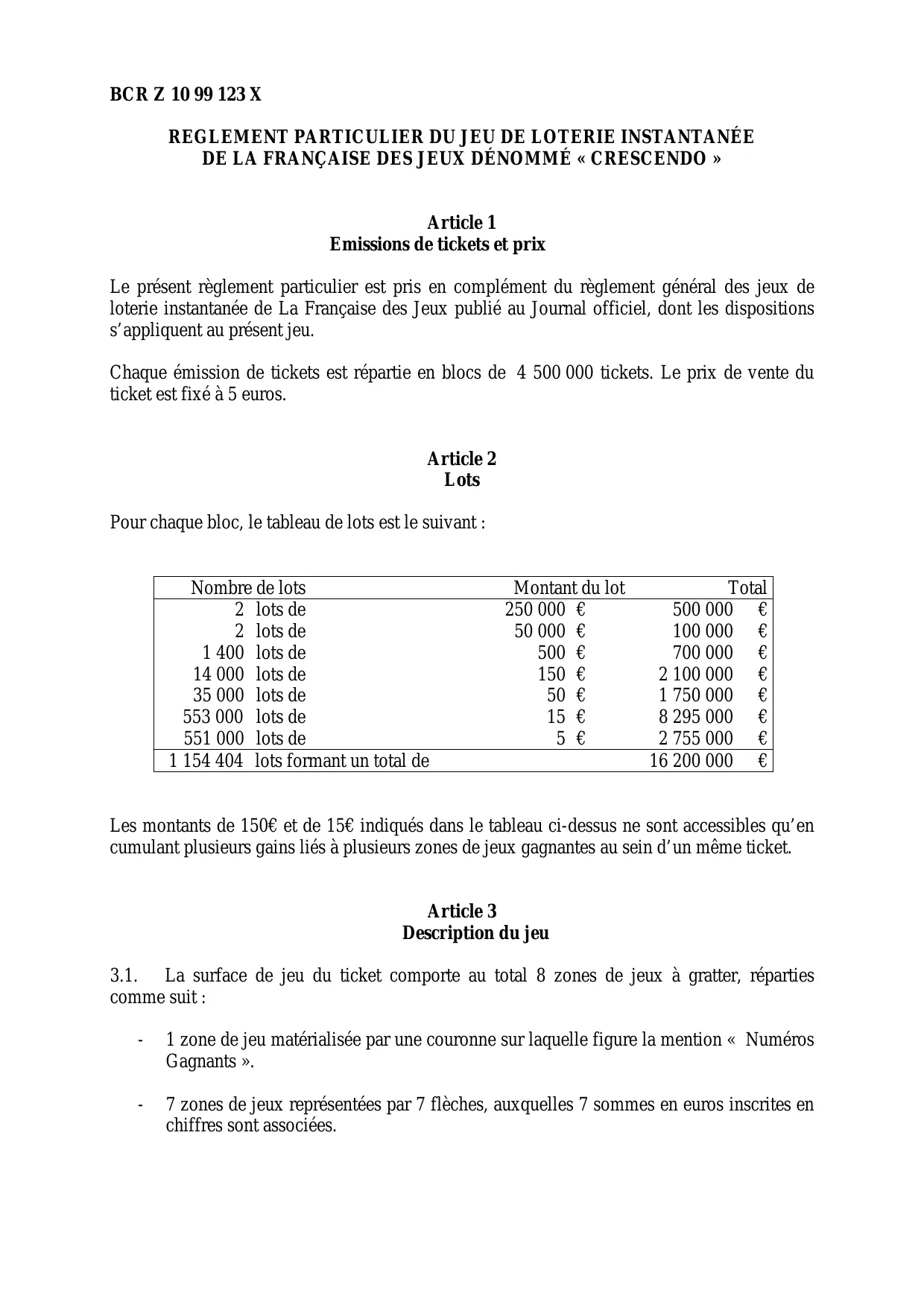 REGLEMENT PARTICULIER DU JEU DE LOTERIE INSTANTANÉE DE LA FRANÇAISE DES JEUX DÉNOMMÉ « CRESCENDO » Article 1 Emissions de tickets et prix Le présent règlement particulier est pris en complément du règlement général des jeux de loterie instantanée de La Française des Jeux publié au Journal officiel, dont les dispositions s’appliquent au présent jeu. Chaque émission de tickets est répartie en blocs de 4 500 000 tickets. Le prix de vente du ticket est fixé à 5 euros. Article 2 Lots Pour chaque bloc, le tableau de lots est le suivant : Nombre de lots 2 lots de 2 lots de 1 400 lots de 14 000 lots de 35 000 lots de 553 000 lots de 551 000 lots de 1 154 404 lots formant un total de Montant du lot 250 000 € 50 000 € 500 € 150 € 50 € 15 € 5 € Total 500 000 € 100 000 € 700 000 € 2 100 000 € 1 750 000 € 8 295 000 € 2 755 000 € 16 200 000 € Les montants de 150€ et de 15€ indiqués dans le tableau ci-dessus ne sont accessibles qu’en cumulant plusieurs gains liés à plusieurs zones de jeux gagnantes au sein d’un même ticket. Article 3 Description du jeu 3.1. La surface de jeu du ticket comporte au total 8 zones de jeux à gratter, réparties comme suit :