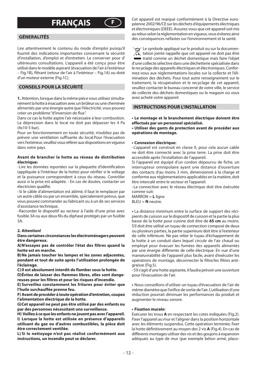 Lire attentivement le contenu du mode d'emploi puisqu'il fournit des indications importantes concernant la sécurité d'installation, d'emploi et d'entretien. Le conserver pour d'ultérieures consultations. L'appareil a ete conso pour etre utilisared in the mode aspirant (evacuation de I'air a l'estiereur - Fig.1B), filtrant (retour de I'air a I'intérieur - Fig.1A) ou dotted'un moteur externe (Fig.1C).