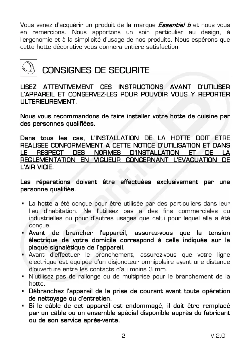 EHD 911V - Hotte ESSENTIELB - Notice d'utilisation et mode d'emploi gratuit
