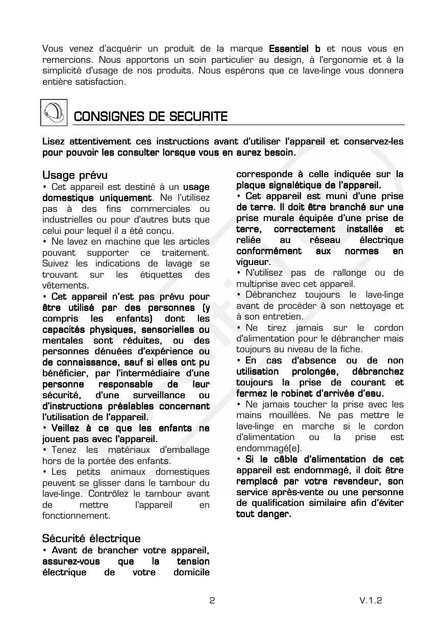 Vous venez d’acquérir un produit de la marque Essentiel b et nous vous en remercions. Nous apportons un soin particulier au design, à l'ergonomie et à la simplicité d'usage de nos produits. Nous espérons que ce lave-linge vous donnera entière satisfaction.