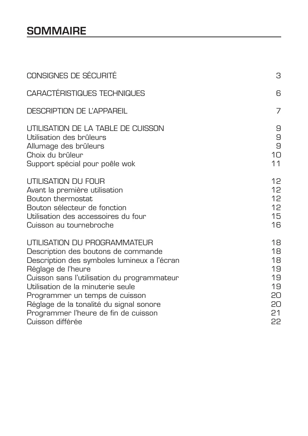 Description des boutons de commande Description des symboles lumineux a l’écran Réglage de l’heure Cuisson sans l’utilisation du programmateur Utilisation de la minuterie seule Programmer un temps de cuisson Réglage de la tonalité du signal sonore Programmer l’heure de fin de cuisson Cuisson différée