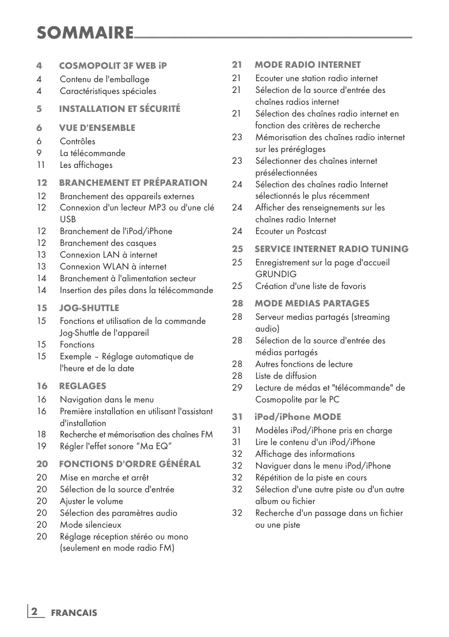 21 MODE RADIO INTERNET 21 Ecouter une station radio internet 21 Sélection de la source d'entrée des chaînes radios internet 21 Sélection des chaînes radio internet en fonction des critères de recherche 23 Mémorisation des chaînes radio internet sur les préréglages 23 Sélectionner des chaînes internet présélectionnées 24 Sélection des chaînes radio Internet sélectionnés le plus récemment 24 Afficher des renseignements sur les chaînes radio Internet 24 Ecouter un Postcast 25 SERVICE INTERNET RADIO TUNING 25 Enregistrement sur la page d'accueil GRUNDIG 25 Création d'une liste de favoris 28 MODE MEDIAS PARTAGES 28 Serveur medias partagés (streaming audio) 28 Sélection de la source d'entrée des médias partagés 28 Autres fonctions de lecture 28 Liste de diffusion 29 Lecture de médas et "télécommande" de Cosmopolite par le PC 31 iPod/iPhone MODE 31 Modèles iPod/iPhone pris en charge 31 Lire le contenu d'un iPod/iPhone 32 Affichage des informations 32 Naviguer dans le menu iPod/iPhone 32 Répétition de la piste en cours 32 Sélection d'une autre piste ou d'un autre album ou fichier 32 Recherche d'un passage dans un fichier ou une piste