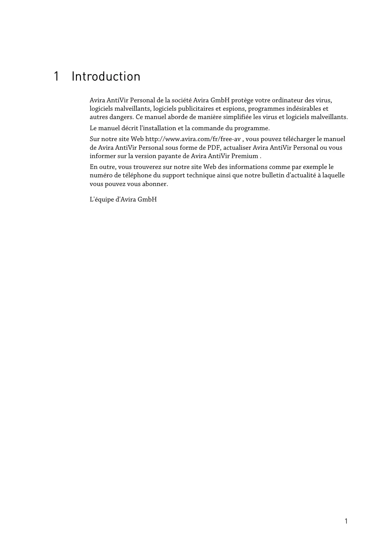 11.4.8 Avertissements.......................................................................................................72 iii 1 Introduction Avira AntiVir Personal de la société Avira GmbH protège votre ordinateur des virus, logiciels malveillants, logiciels publicitaires et espions, programmes indésirables et autres dangers. Ce manuel aborde de manière simplifiée les virus et logiciels malveillants. Le manuel décrit l'installation et la commande du programme. Sur notre site Web http://www.avira.com/fr/free-av , vous pouvez télécharger le manuel de Avira AntiVir Personal sous forme de PDF, actualiser Avira AntiVir Personal ou vous informer sur la version payante de Avira AntiVir Premium . En outre, vous trouverez sur notre site Web des informations comme par exemple le numéro de téléphone du support technique ainsi que notre bulletin d'actualité à laquelle vous pouvez vous abonner. L'équipe d'Avira GmbH