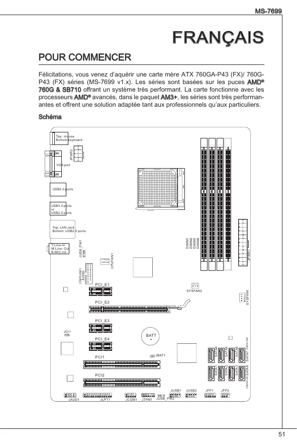 FrançaiS Pour coMMencer Félicitations, vous venez d’aquérir une carte mère ATX 760GA-P43 (FX)/ 760GP43 (FX) séries (MS-7699 v1.x). Les séries sont basées sur les puces AMD® 760G & SB710 offrant un système très performant. La carte fonctionne avec les processeurs AMD® avancés, dans le paquet AM3+, les séries sont très performanantes et offrent une solution adaptée tant aux professionnels qu’aux particuliers. Schéma