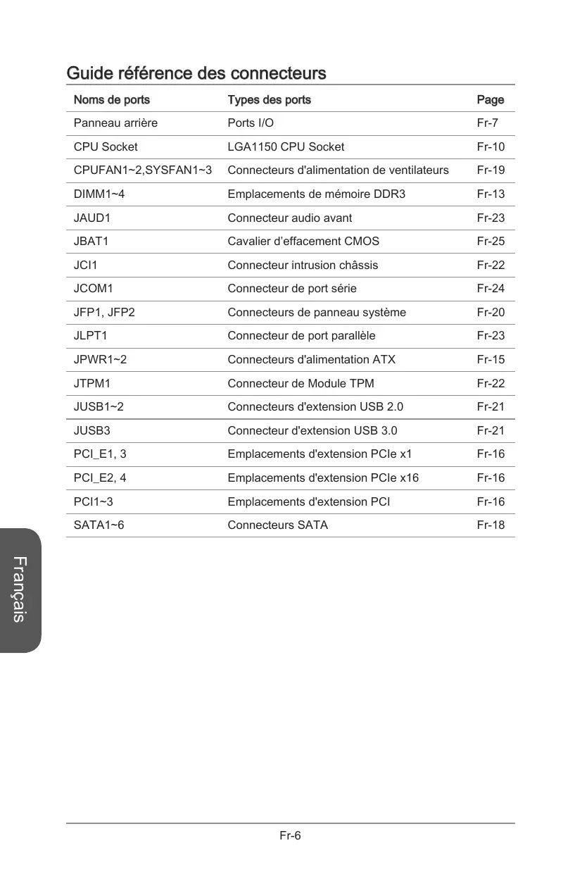 - Si vous voulez utiliser un périphérique USB 3.0, il faut utiliser une câble USB 3.0. Fr-21 Français Le port USB 3.0 est rétro-compatible avec les périphériques USB 2.0. Il supporte un taux de transfert jusqu’à 5 Gbit/s (Super-Vitesse). JTPM1 : Connecteur de Module TPM Ce connecteur est relié à un module TPM (Trusted Platform Module) en option. Veuillez vous référer au manuel du module TPM pour plus d’information détaillée.