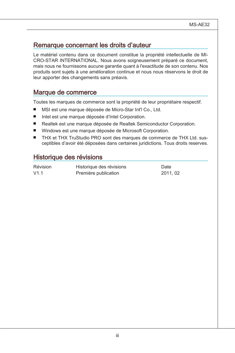 MS-AE32 Remarque concernant les droits d’auteur Le matériel contenu dans ce document constitue la propriété intellectuelle de MICRO-STAR INTERNATIONAL. Nous avons soigneusement préparé ce document, mais nous ne fournissons aucune garantie quant à l'exactitude de son contenu. Nos produits sont sujets à une amélioration continue et nous nous réservons le droit de leur apporter des changements sans préavis. Marque de commerce Toutes les marques de commerce sont la propriété de leur propriétaire respectif.