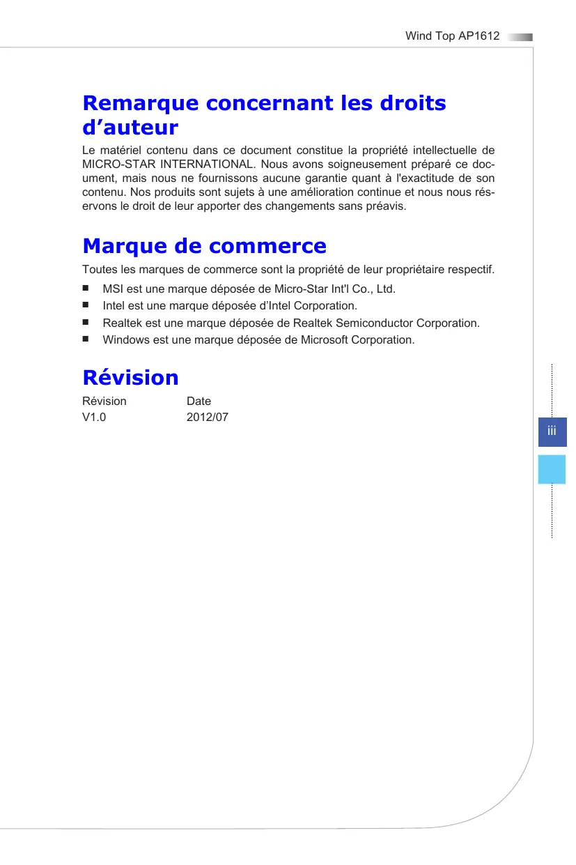 Première installation de démarrage du système3-2 Calibration d’écran tactile (seulement pour le mode de simple clic)3-3 Connexions réseau sous Windows3-5 Gestion de l’alimentation3-10 Outil de récupération du système3-12 Wind Top AP1612 Remarque concernant les droits d’auteur Le matériel contenu dans ce document constitue la propriété intellectuelle de MICRO-STAR INTERNATIONAL. Nous avons soigneusement préparé ce document, mais nous ne fournissons aucune garantie quant à l'exactitude de son contenu. Nos produits sont sujets à une amélioration continue et nous nous réservons le droit de leur apporter des changements sans préavis. Marque de commerce Toutes les marques de commerce sont la propriété de leur propriétaire respectif.