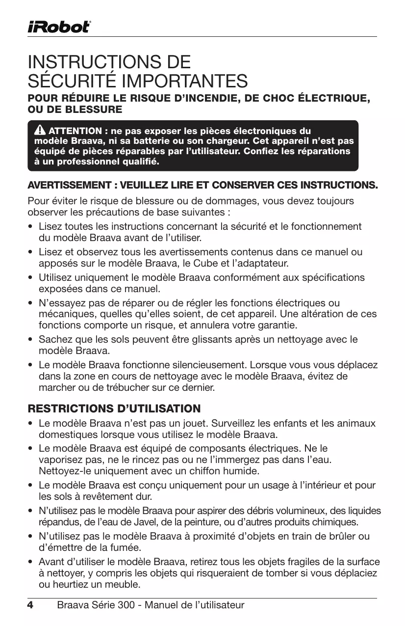 ATTENTION : ne pas exposer les pièces électroniques du modèle Braava, ni sa batterie ou son chargeur. Cet appareil n’est pas équipé de pièces réparables par l’utilisateur. Confiez les réparations à un professionnel qualifié.