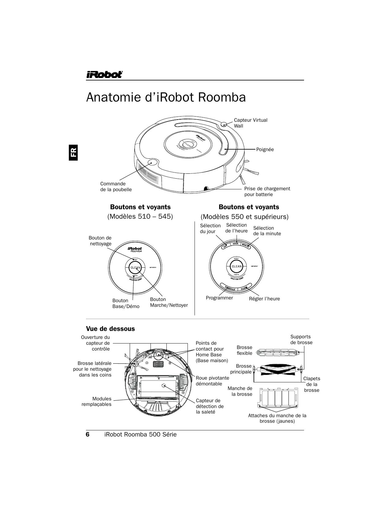 Poignée Commande de la poubelle Prise de chargement pour batterie Boutons et voyants (Modèles 510 – 545) Boutons et voyants (Modèles 550 et supérieurs) Sélection Sélection de l’heure du jour Sélection de la minute Bouton de nettoyage Bouton Base/Démo Bouton Marche/Nettoyer Programmer Régler l’heure Vue de dessous Ouverture du capteur de contrôle Brosse latérale pour le nettoyage dans les coins Modules remplaçables