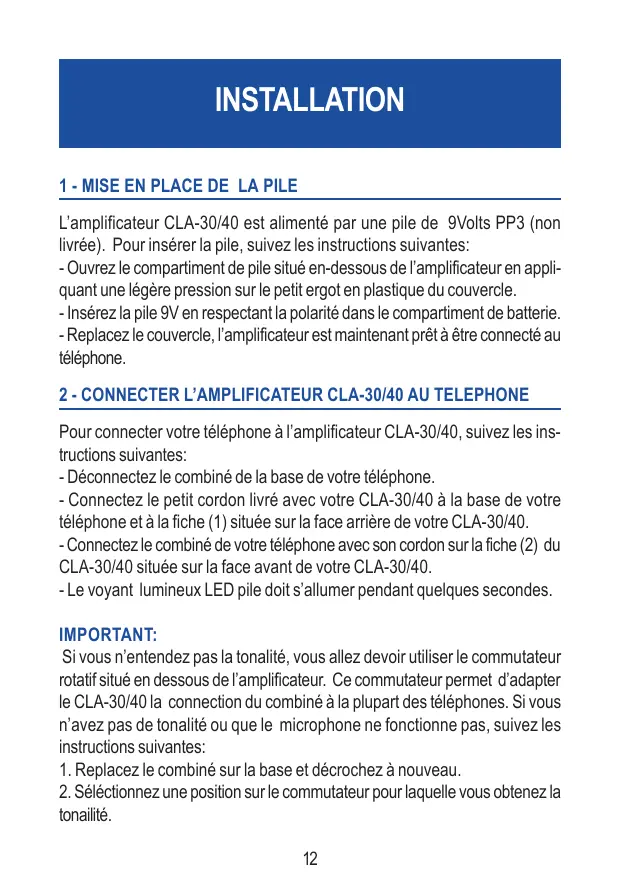 Pour connecter votre téléphone à l’amplificateur CLA-30/40, suivez les instructions suivantes: - Déconnectez le combiné de la base de votre téléphone. - Connectez le petit cordon livré avec votre CLA-30/40 à la base de votre téléphone et à la fiche (1) située sur la face arrière de votre CLA-30/40. - Connectez le combiné de votre téléphone avec son cordon sur la fiche (2) du CLA-30/40 située sur la face avant de votre CLA-30/40. - Le voyant lumineux LED pile doit s’allumer pendant quelques secondes. IMPORTANT: Si vous n’entendez pas la tonalité, vous allez devoir utiliser le commutateur rotatif situé en dessous de l’amplificateur. Ce commutateur permet d’adapter le CLA-30/40 la connection du combiné à la plupart des téléphones. Si vous n’avez pas de tonalité ou que le microphone ne fonctionne pas, suivez les instructions suivantes: