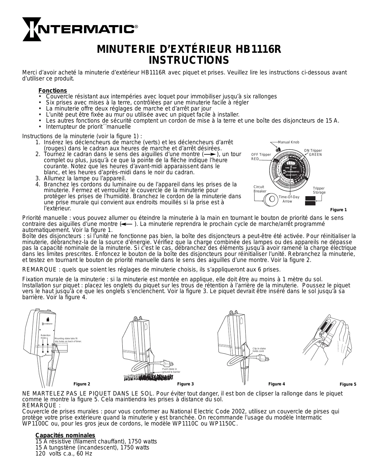 minuterie. Fermez et verrouillez le couvercle de la minuterie pour protéger les prises de l’humidité. Branchez le cordon de la minuterie dans une prise murale qui convient aux endroits mouillés si la prise est à l’extérieur. Tripper Storage Time-Of-Day Arrow Figure 1 Priorité manuelle : vous pouvez allumer ou éteindre la minuterie à la main en tournant le bouton de priorité dans le sens contraire des aiguilles d’une montre ( ). La minuterie reprendra le prochain cycle de marche/arrêt programmé automatiquement. Voir la figure 1. Boîte des disjoncteurs : si l’unité ne fonctionne pas bien, la boîte des disjoncteurs a peut-être été activée. Pour réinitialiser la minuterie, débranchez-la de la source d’énergie. Vérifiez que la charge combinée des lampes ou des appareils ne dépasse pas la capacité nominale de la minuterie. Si c’est le cas, débranchez des éléments jusqu’à avoir ramené la charge électrique dans les limites prescrites. Enfoncez le bouton de la boîte des disjoncteurs pour réinitialiser l’unité. Rebranchez la minuterie, et testez en tournant le bouton de priorité manuelle dans le sens des aiguilles d’une montre. Voir la figure 2. REMARQUE : quels que soient les réglages de minuterie choisis, ils s’appliqueront aux 6 prises. Fixation murale de la minuterie : si la minuterie est montée en applique, elle doit être au moins à 1 mètre du sol. Installation sur piquet : placez les onglets du piquet sur les trous de rétention à l’arrière de la minuterie. Poussez le piquet vers le haut jusqu’à ce que les onglets s’enclenchent. Voir la figure 3. Le piquet devrait être inséré dans le sol jusqu’à sa barrière. Voir la figure 4. Retention Holes Mounting stake tabs fit into holes on back of timer. Clip in stake holds cord Push stake in ground to barrier Figure 2 Figure 3 Figure 4 Figure 5 NE MARTELEZ PAS LE PIQUET DANS LE SOL. Pour éviter tout danger, il est bon de clipser la rallonge dans le piquet comme le montre la figure 5. Cela maintiendra les prises à distance du sol. REMARQUE : Couvercle de prises murales : pour vous conformer au National Electric Code 2002, utilisez un couvercle de pirses qui protège votre prise extérieure quand la minuterie y est branchée. On recommande l’usage du modèle Intermatic WP1100C ou, pour les gros jeux de cordons, le modèle WP1110C ou WP1150C. Capacités nominales 15 A résistive (filament chauffant), 1750 watts 15 A tungstène (incandescent), 1750 watts 120 volts c.a., 60 Hz Pour votre sécurité Ne pas modifier, épisser ni réparer la présente unité. Ne l’utilisez pas en cas de pluie. Rangez l’unité à l’intérieru quand elle ne sert pas. Insérez les prises à fond. Usage réservé aux adultes. N’excédez pas les charges électriques nominales. Déroulez complètement le cordon d’alimentation avant d’utiliser l’unité. Appareil non conçu comme source d’énergie permanente. Garantie restreinte d’un an Si, dans les limites d’un (1) an après la date d’achat, le produit tombe en panne à cause d’un défaut de fabrication, Intermatic, Inc. réparera ou remplacera l’unité gratuitement, à son entière discrétion. La présente garantie s’applique seulement à l’acheteur original et n’est pas transférable. INTERMATIC INCROPORATED NE SERA PAS RESPONSABLE DES DOMMAGES CONSÉCUTIFS. CERTAINS ÉTATS AMÉRICAINS NE PERMETTANT PAS L’EXCLUSION OU LA LIMITATION DES DOMMAGES CONSÉCUTIFS, LA LIMITATION OU L’EXCLUSION CI-DESSUS PEUT NE PAS S’APPLIQUER À VOUS. LA GARANTIE PREND EFFET AUX LIEU ET PLACE DE TOUTES AUTRES GARANTIES EXPRESSES OU IMPLICITES. TOUTES LES GARANTIES IMPLICITES, DONT LA GARANTIE DE QUALITÉ MARCHANDE ET LA GARANTIE DE CONVENANCE POUR UN USAGE PARTICULIER, SONT MODIFIÉES PAR LES PRÉSENTES DE FAÇON À N’EXISTER QU’AUX TERMES DE CETTE GARANTIE RESTREINTE, ET ELLES AURONT LA MÊME DURÉE QUE LA PÉRIODE DE GARANTIE SUSMENTIONNÉE. CERTAINS ÉTATS NE PERMETTANT PAS LES LIMITATIONS DE DURÉE D’UNE GARANTIE IMPLICITE, LA LIMITATION CI-DESSUS PEUT NE PAS S’APPLIQUER À VOUS. La garantie ne s’applique ni : (a) aux dommages accidentels, aux mauvaises manipulations ni aux chutes; (b) aux cas fortuits; (c) aux unités qui ont subi une réparation non autorisée, qui ont été ouvertes, démontées ou autrement modifiées; (d) aux unités non employées conformément aux instructions; (e) aux dommages excédant le prix du produit; (f) aux lampes scellées, aux ampoules de lampe électrique ou aux deux, aux DEL et aux piles; (g) au fini d’une portion quelconque de produit, comme aux éraflures de surface, à l’action des intempéries ou aux deux, considérées comme une usure normale. Certains états interdisant la limitation de dommages, la clause précédent peut ne pas sa[[liquer à vous. Cette garantie vous donne des droits légaux précis ; vous êtes susceptible d’avoit d’autres droits en fonction de l’état dans lequel vous vous trouvez. INTERMATIC INCORPORATED