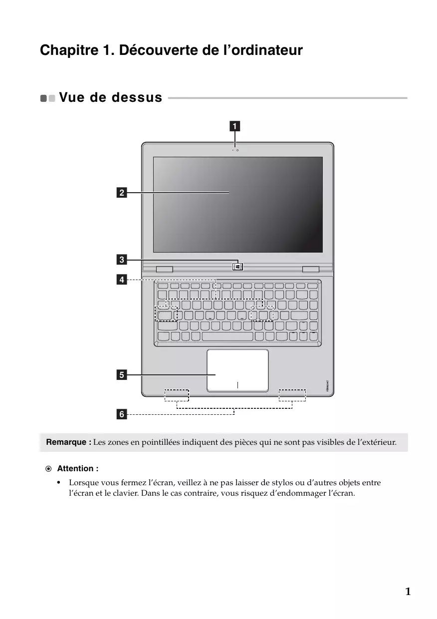 Lorsque vous fermez l’écran, veillez à ne pas laisser de stylos ou d’autres objets entre l’écran et le clavier. Dans le cas contraire, vous risquez d’endommager l’écran.