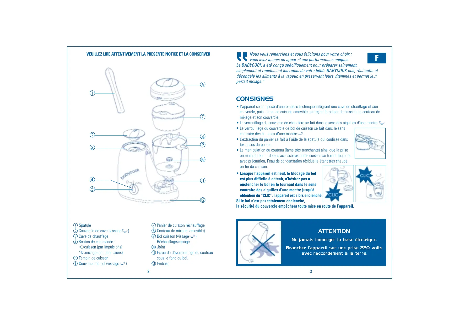 VEUILLEZ LIRE ATTENTIVEMENT LA PRESENTE NOTICE ET LA CONSERVER Nous vous remercions et vous félicitons pour votre choix : vous avez acquis un appareil aux performances uniques. Le BABYCOOK a été conçu spécifiquement pour préparer sainement, simplement et rapidement les repas de votre bébé. BABYCOOK cuit, réchauffe et décongèle les aliments à la vapeur, en préservant leurs vitamines et permet leur parfait mixage.”