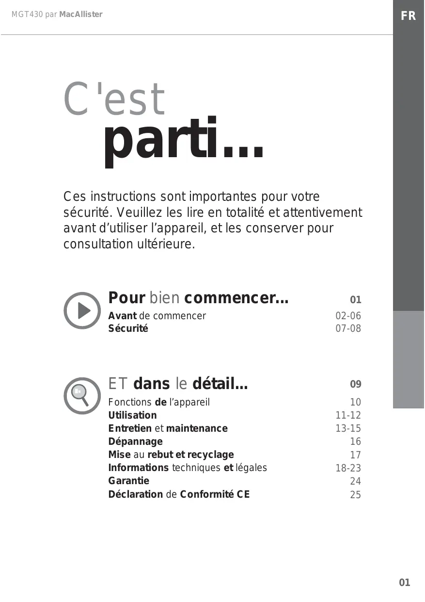 MGT430 par MacAllister C'est parti... Ces instructions sont importantes pour votre sécurité. Veuillez les lire en totalité et attentivement avant d’utiliser l’appareil, et les conserver pour consultation ultérieure. Pour bien commencer... Avant de commencer Sécurité ET dans le détail... Fonctions de l’appareil Utilisation Entretien et maintenance Dépannage Mise au rebut et recyclage Informations techniques et légales Garantie Déclaration de Conformité CE