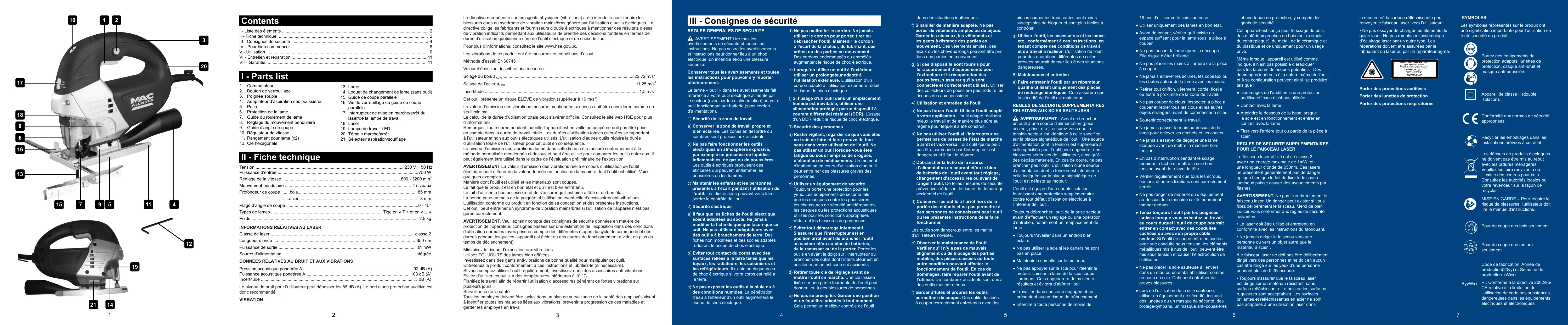 ● Ne pas toucher la lame après la découpe. Elle risque d’être brûlante. Même lorsque l’appareil est utilisé comme indiqué, il n’est pas possible d’éradiquer tous les facteurs de risques potentiels. Des dommages inhérents à la nature même de l’outil et à sa configuration peuvent ainsi se produire tels que : ● Ne pas placer les mains à l’arrière de la pièce à couper. ● Ne jamais enlever les sciures, les copeaux ou les chutes autour de la lame avec les mains. ● Retirer tout chiffon, vêtement, corde, ficelle ou autre à proximité de la zone de travail. ● Dommages de l’audition si une protection auditive efficace n’est pas utilisée. ● Ne pas couper de clous. Inspecter la pièce à couper et retirer tous les clous et les autres objets étrangers avant de commencer à scier. ● Contact avec la lame. ● Ne jamais passer la main au-dessus de la lame pour enlever les déchets et les chutes. EN60825-1:2007 Porter des protections auditives Appareil de classe II (double isolation). Porter des lunettes de protection Porter des protections respiratoires Conformité aux normes de sécurité appropriées. Recycler les emballages dans les installations prévues à cet effet Les déchets de produits électriques ne doivent pas être mis au rebut avec les ordures ménagères. Veuillez les faire recycler là où il existe des centres pour cela. Consultez les autorités locales ou votre revendeur sur la façon de recycler. Le faisceau laser utilisé est de classe 2 avec une énergie maximale de 1mW et une longueur d’onde de 650nm. Ces lasers ne présentent généralement pas de danger optique bien que le fait de fixer le faisceau lumineux puisse causer des aveuglements par flashes. ● Vérifier régulièrement que tous les écrous, boulons et autres fixations sont correctement serrés. ● Ne pas ranger de matériel ou d’équipement au-dessus de la machine car ils pourraient tomber dedans. ● Travailler dans une zone dégagée et ne présentant aucun risque de trébuchement. Portez des équipements de protection adaptés: lunettes de protection, casque anti-bruit et masque anti-poussière.