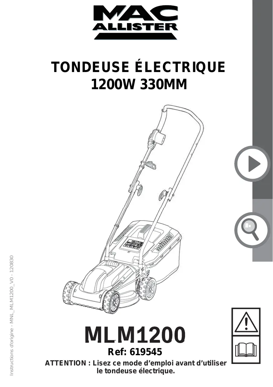Instructions d'origine - MNL_MLM1200_V0 - 120830 TONDEUSE ÉLECTRIQUE 1200W 330MM MLM1200 Ref: 619545 ATTENTION : Lisez ce mode d’emploi avant d’utiliser le tondeuse électrique.