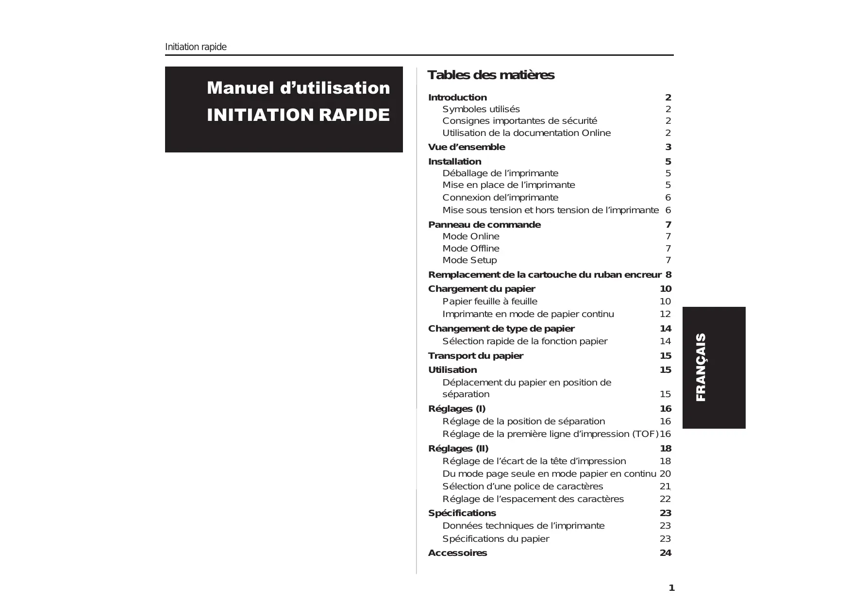 Ce manuel d'utilisation est une initiation rapide sur la manière d'utiliser l'imprimante et permet également aux utilisateurs inexplémentés de se servir de l'imprimante. Il déscrit les fonctions principales de l'imprimante et contient des informations indispensablees à connaître pour le travail quotidien avec l'imprimante. Vous trouvez une description détaillée de l'imprimante, de ses caractéristiques et des informations supplémentaires dans le manuel de référence sur la Online CD-ROM, à l'avant-dernière page de ce manuel.