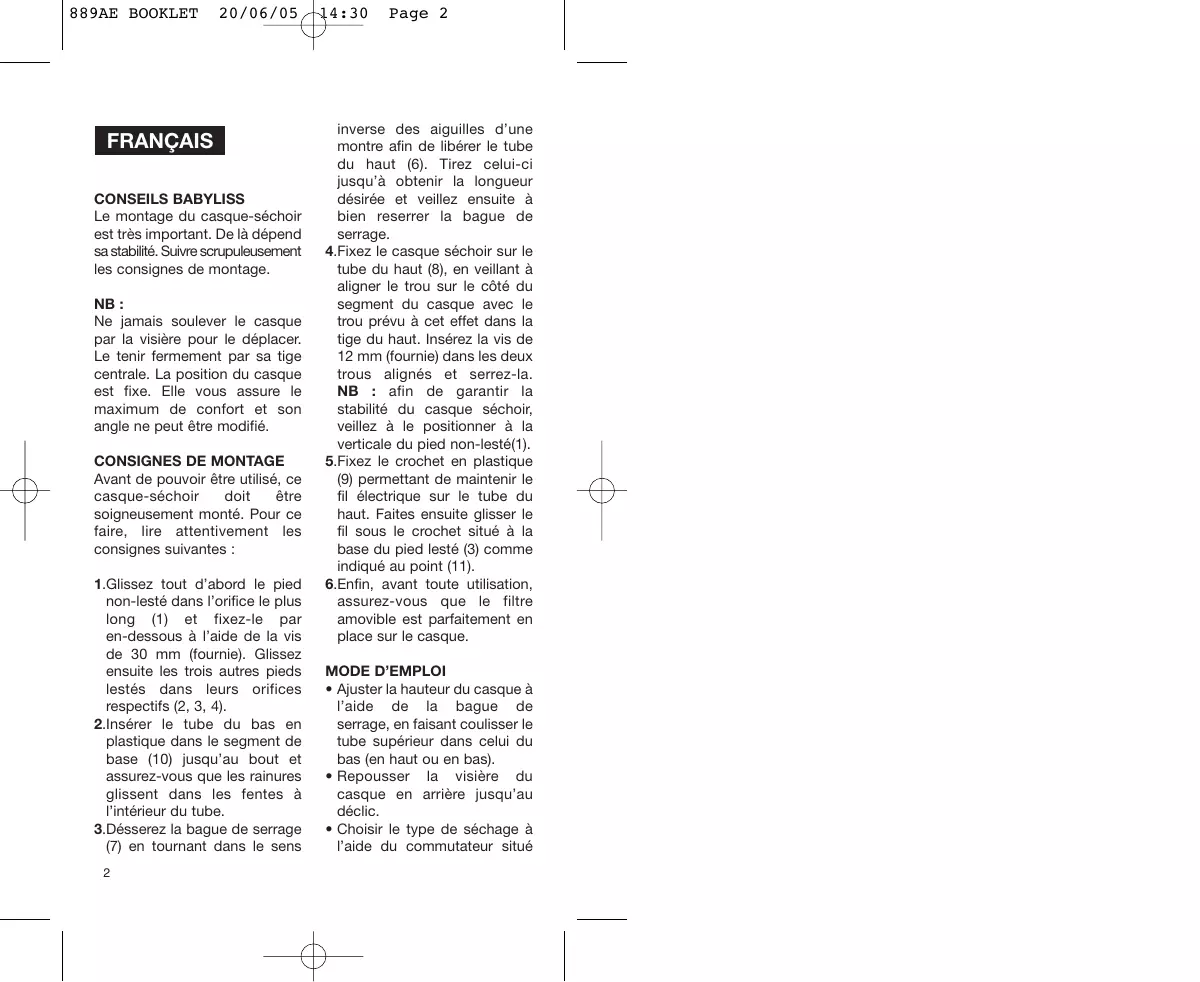FRANÇAIS CONSEILS BABYLISS Le montage du casque-séchoir est très important. De là dépend sa stabilité. Suivre scrupuleusement les consignes de montage.