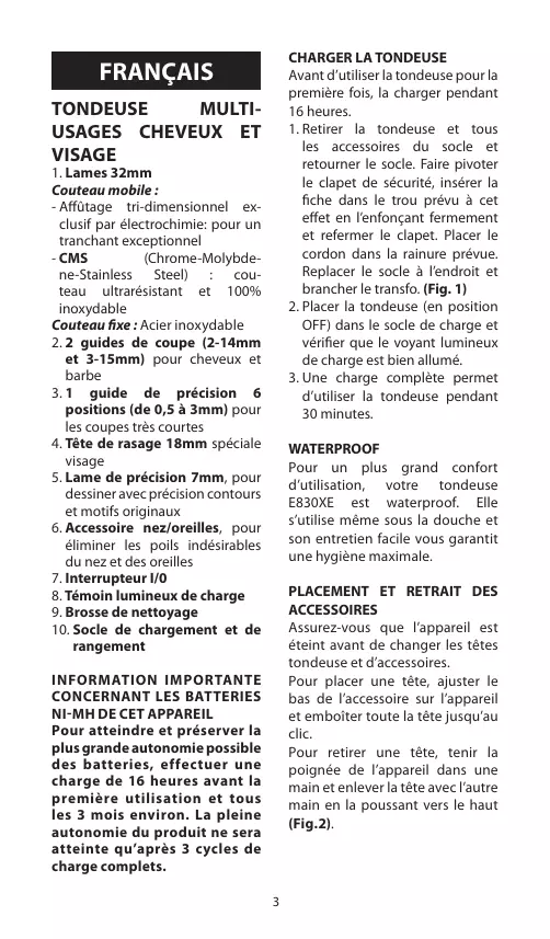 ACCESSOIRES Assurez-vous que l’appareil est éteint avant de changer les têtes tondeuse et d’accessoires. Pour placer une tête, ajuster le bas de l’accessoire sur l’appareil et emboîter toute la tête jusqu’au clic. Pour retirer une tête, tenir la poignée de l’appareil dans une main et enlever la tête avec l’autre main en la poussant vers le haut (Fig.2). Information importante concernant lES batterieS Ni-MH de cet appareil Pour atteindre et préserver la plus grande autonomie possible des batteries, effectuer une charge de 16 heures avant la première utilisation et tous les 3 mois environ. La pleine autonomie du produit ne sera atteinte qu’après 3 cycles de charge complets.