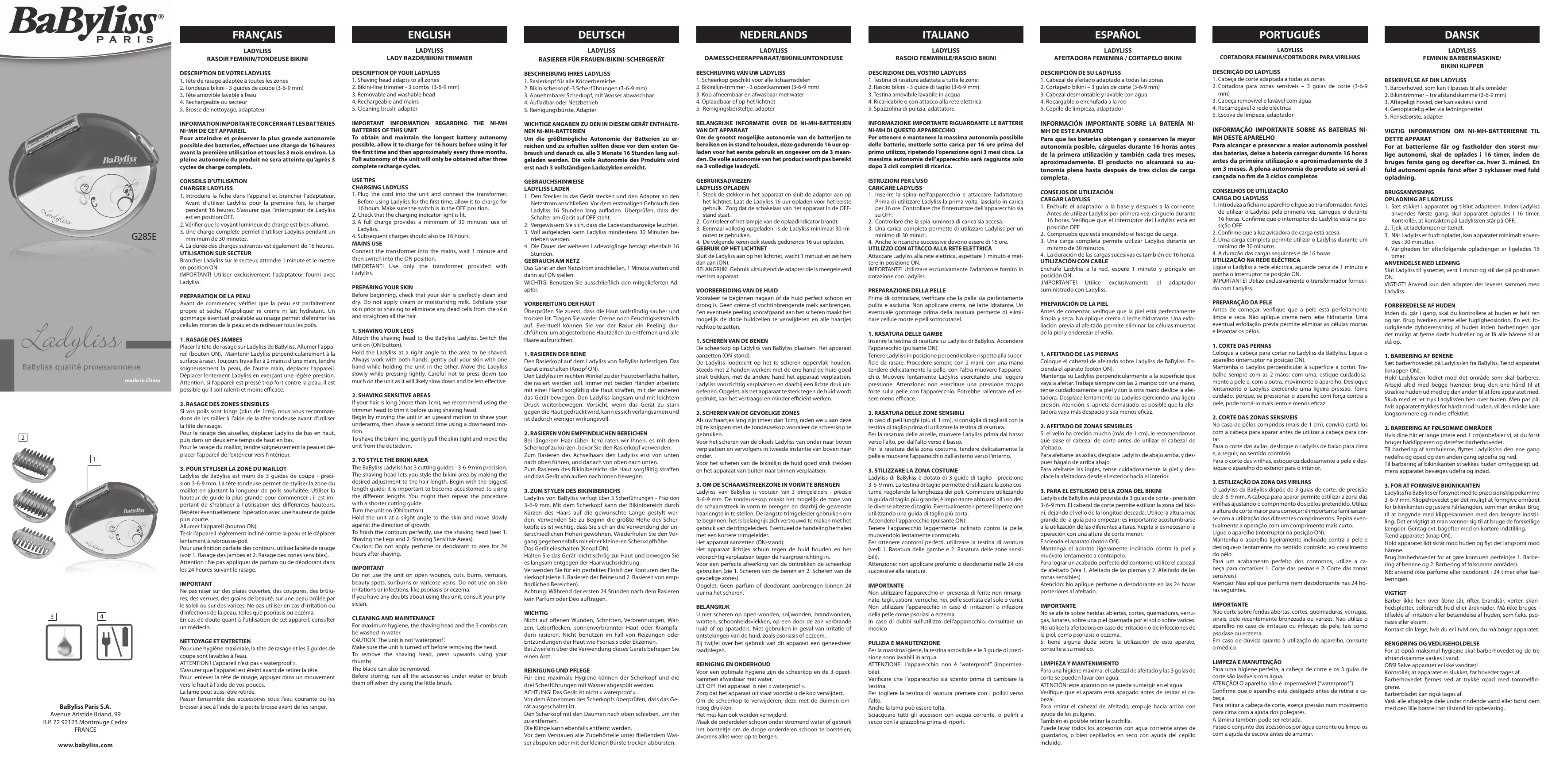BIKINI KLIPPER DESCRIPTION DE VOTRE LADYLISS 1. Tête de rasage adaptée à toutes les zones 2. Tondeuse bikini - 3 guides de coupe (3-6-9 mm) 3. Tête amovible lavable à l’eau 4. Rechargeable ou secteur 5. Brosse de nettoyage, adaptateur
