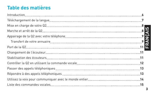 Liste des commandes vocales > Mon appareil est-il connecté? — La Q2 vérifie si votre téléphone est connecté et tente d’établir la connexion si vous ne l’êtes pas. > Rappeler — Rappelle le numéro du dernier appel entrant reçu sur la Q2. > Vérifier la batterie — Vous indique le niveau de charge de la pile du Q2. > Favoris — Attendez que la Q2 vous demande Quel favori? puis dites un des favoris suivants : Informations Sports Films Cours de la bourse Naviguer Circulation FRANÇAIS Quand vous souhaitez exécuter une action, il vous suffit de cliquer sur le bouton MFB, et attendre que la Q2 vous demande de Dites une commande. Puis dites une des commandes suivantes : Nouvelles Météo Remarque : la disponibilité des Favoris dépend de votre territoire et de votre entreprise de téléphonie mobile. Des frais peuvent s’appliquer à ces appels. > Jumelez — Place la Q2 en mode d’appairage. Tout téléphone appairé est déconnecté.