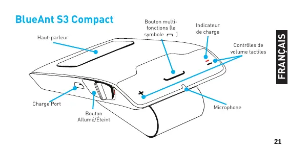 - Afin d’utiliser cette fonction, votre téléphone et votre réseau doivent prendre en charge la fonction d’appel en attente. Afin de combiner avec un autre téléphone, remettez votre S3 en mode combinaison en appuyant sur le symbole pendant environ 6 secondes. > Votre S3 peut stocker des informations de combinaison pour 2 téléphones maximum. > Votre S3 peut se connecter avec 2 téléphones à la fois (multipoint). Lorsque 2 téléphones sont connectés en même temps : > Vous pouvez répondre aux appels sur l’un ou l’autre des téléphones par l’intermédiaire du S3. FRANÇAIS Combiner avec un autre téléphone / Multipoint > Chaque fois que vos téléphones se reconnectent au S3, celui qui se connecte en premier devient le « téléphone principal ». Si vous utilisez les boutons du S3 afin d’activer une fonction sur votre téléphone (telle que Bis, Rappel ou Numérotation vocale), cette fonction se met en action sur le téléphone principal. BlueAnt
