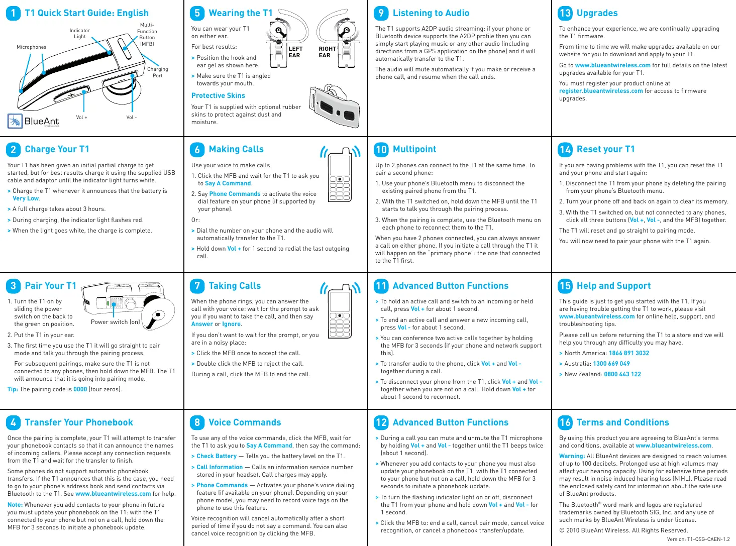 Fonctionnalités avancées des boutons > Maintenez les boutons Vol + et Vol - enfoncés en même temps pendant une seconde pendant un appel pour activer et désactiver le microphone de l’oreillette T1. > Chaque fois que vous ajouterez des contacts à votre téléphone, vous devrez mettre à jour l’annuaire de l’oreillette T1; l’oreillette T1 étant connectée à votre téléphone sans être sur un appel, maintenez le BMF enfoncé pendant 3 secondes afin d’initier une mise à jour de l’annuaire. > Pour allumer ou éteindre le voyant lumineux, déconnectez l’oreillette T1 de votre téléphone et maintenez les boutons Vol + et Vol - enfoncés pendant une seconde. Aide et assistance Ce guide est uniquement conçu pour vous aider à utiliser rapidement l’oreillette T1. En cas de problème avec votre oreillette T1, veuillez consulter le site www.blueantwireless.com pour obtenir de l’aide en ligne, de l’assistance technique ainsi que des conseils de dépannage. Veuillez nous appeler avant de retourner l’oreillette T1 au magasin où vous l’avez achetée. Nous vous aiderons à trouver une solution à votre problème. > Amérique du Nord : 1866 891 3032 > Australie : 1300 669 049 > Nouvelle-Zélande : 0800 443 122