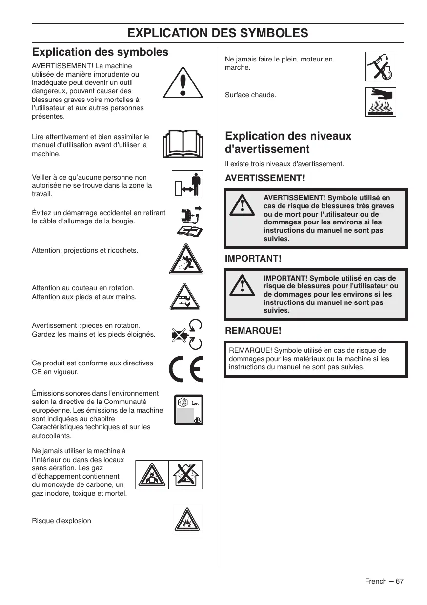 Explication des symboles AVERTISSEMENT! La machine utilisée de manière imprudente ou inadéquate peut devenir un outil dangereux, pouvant causer des blessures graves voire mortelles à l’utilisateur et aux autres personnes présentes. Lire attentivement et bien assimiler le manuel d’utilisation avant d’utiliser la machine. Ne jamais faire le plein, moteur en marche. Surface chaude. Explication des niveaux d'avertissement Il existe trois niveaux d'avertissement. Veiller à ce qu’aucune personne non autorisée ne se trouve dans la zone la travail. Évitez un démarrage accidentel en retirant le câble d'allumage de la bougie. AVERTISSEMENT!