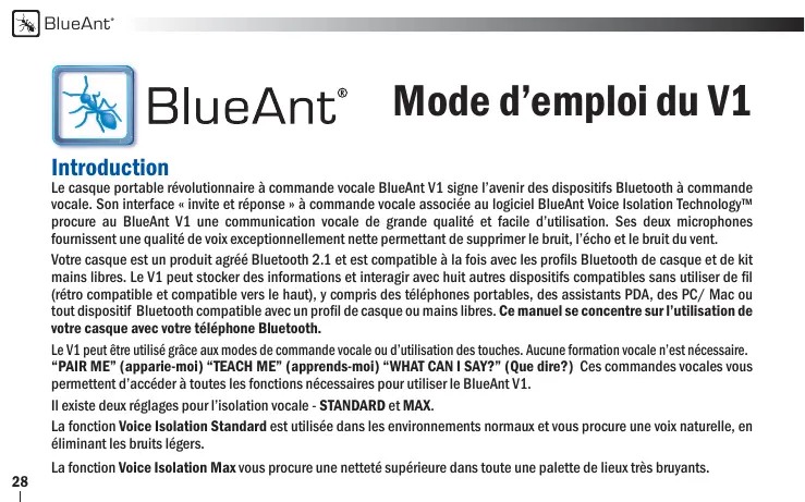 Le casque portable révolutionnaire à commande vocale BlueAnt V1 signe l’avenir des dispositifs Bluetooth à commande vocale. Son interface « invite et réponse » à commande vocale associée au logiciel BlueAnt Voice Isolation Technology™ procure au BlueAnt V1 une communication vocale de grande qualité et facile d’utilisation. Ses deux microphones fournissent une qualité de voix exceptionnellement nette permettant de supprimer le bruit, l’écho et le bruit du vent. Votre casque est un produit agréé Bluetooth 2.1 et est compatible à la fois avec les profils Bluetooth de casque et de kit mains libres. Le V1 peut stocker des informations et interagir avec huit autres dispositifs compatibles sans utiliser de fil (rétro compatible et compatible vers le haut), y compris des téléphones portables, des assistants PDA, des PC/ Mac ou tout dispositif Bluetooth compatible avec un profil de casque ou mains libres. Ce manuel se concentre sur l’utilisation de votre casque avec votre téléphone Bluetooth. Le V1 peut être utilisé grâce aux modes de commande vocale ou d’utilisation des touches. Aucune formation vocale n’est nécessaire. “PAIR ME” (apparie-moi) “TEACH ME” (apprends-moi) “WHAT CAN I SAY?” (Que dire?) Ces commandes vocales vous permettent d’accéder à toutes les fonctions nécessaires pour utiliser le BlueAnt V1. Il existe deux réglages pour l’isolation vocale - STANDARD et MAX. La fonction Voice Isolation Standard est utilisée dans les environnements normaux et vous procure une voix naturelle, en éliminant les bruits légers. La fonction Voice Isolation Max vous procure une netteté supérieure dans toute une palette de lieux très bruyants. BlueAnt