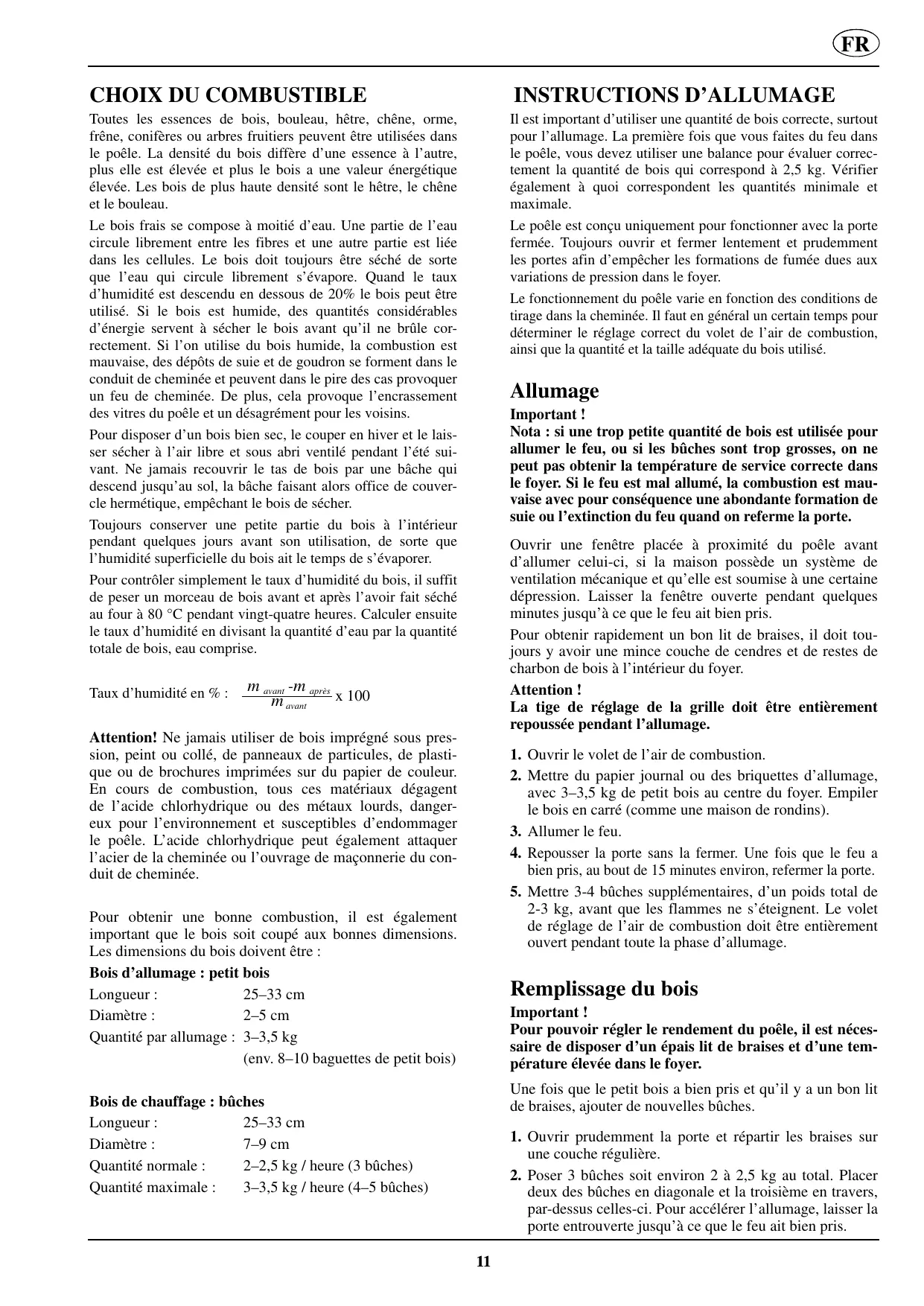 Toutes les essences de bois, bouleau, hêtre, chêne, orme, frêne, conifères ou arbres fruitiers peuvent être utilisées dans le poêle. La densité du bois diffère d’une essence à l’autre, plus elle est élevée et plus le bois a une valeur énergétique élevée. Les bois de plus haute densité sont le hêtre, le chêne et le bouleau. Le bois frais se compose à moitié d’eau. Une partie de l’eau circule librement entre les fibres et une autre partie est liée dans les cellules. Le bois doit toujours être séché de sorte que l’eau qui circule librement s’évapore. Quand le taux d’humidité est descendu en dessous de 20% le bois peut être utilisé. Si le bois est humide, des quantités considérables d’énergie servent à sécher le bois avant qu’il ne brûle correctement. Si l’on utilise du bois humide, la combustion est mauvaise, des dépôts de suie et de goudron se forment dans le conduit de cheminée et peuvent dans le pire des cas provoquer un feu de cheminée. De plus, cela provoque l’encrassement des vitres du poêle et un désagrément pour les voisins. Pour disposer d’un bois bien sec, le couper en hiver et le laisser sécher à l’air libre et sous abri ventilé pendant l’été suivant. Ne jamais recouvrir le tas de bois par une bâche qui descend jusqu’au sol, la bâche faisant alors office de couvercle hermétique, empêchant le bois de sécher. Toujours conserver une petite partie du bois à l’intérieur pendant quelques jours avant son utilisation, de sorte que l’humidité superficielle du bois ait le temps de s’évaporer. Pour contrôler simplement le taux d’humidité du bois, il suffit de peser un morceau de bois avant et après l’avoir fait séché au four à 80 °C pendant vingt-quatre heures. Calculer ensuite le taux d’humidité en divisant la quantité d’eau par la quantité totale de bois, eau comprise. Il est important d’utiliser une quantité de bois correcte, surtout pour l’allumage. La première fois que vous faites du feu dans le poêle, vous devez utiliser une balance pour évaluer correctement la quantité de bois qui correspond à 2,5 kg. Vérifier également à quoi correspondent les quantités minimale et maximale. Le poêle est conçu uniquement pour fonctionner avec la porte fermée. Toujours ouvrir et fermer lentement et prudemment les portes afin d’empêcher les formations de fumée dues aux variations de pression dans le foyer. Le fonctionnement du poêle varie en fonction des conditions de tirage dans la cheminée. Il faut en général un certain temps pour déterminer le réglage correct du volet de l’air de combustion, ainsi que la quantité et la taille adéquate du bois utilisé. Taux d’humidité en % : Allumage Important ! Nota : si une trop petite quantité de bois est utilisée pour allumer le feu, ou si les bûches sont trop grosses, on ne peut pas obtenir la température de service correcte dans le foyer. Si le feu est mal allumé, la combustion est mauvaise avec pour conséquence une abondante formation de suie ou l’extinction du feu quand on referme la porte. Ouvrir une fenêtre placée à proximité du poêle avant d’allumer celui-ci, si la maison possède un système de ventilation mécanique et qu’elle est soumise à une certaine dépression. Laisser la fenêtre ouverte pendant quelques minutes jusqu’à ce que le feu ait bien pris. Pour obtenir rapidement un bon lit de braises, il doit toujours y avoir une mince couche de cendres et de restes de charbon de bois à l’intérieur du foyer. Attention ! La tige de réglage de la grille doit être entièrement repoussée pendant l’allumage. m avant -m après x 100 m avant Attention! Ne jamais utiliser de bois imprégné sous pression, peint ou collé, de panneaux de particules, de plastique ou de brochures imprimées sur du papier de couleur. En cours de combustion, tous ces matériaux dégagent de l’acide chlorhydrique ou des métaux lourds, dangereux pour l’environnement et susceptibles d’endommager le poêle. L’acide chlorhydrique peut également attaquer l’acier de la cheminée ou l’ouvrage de maçonnerie du conduit de cheminée.