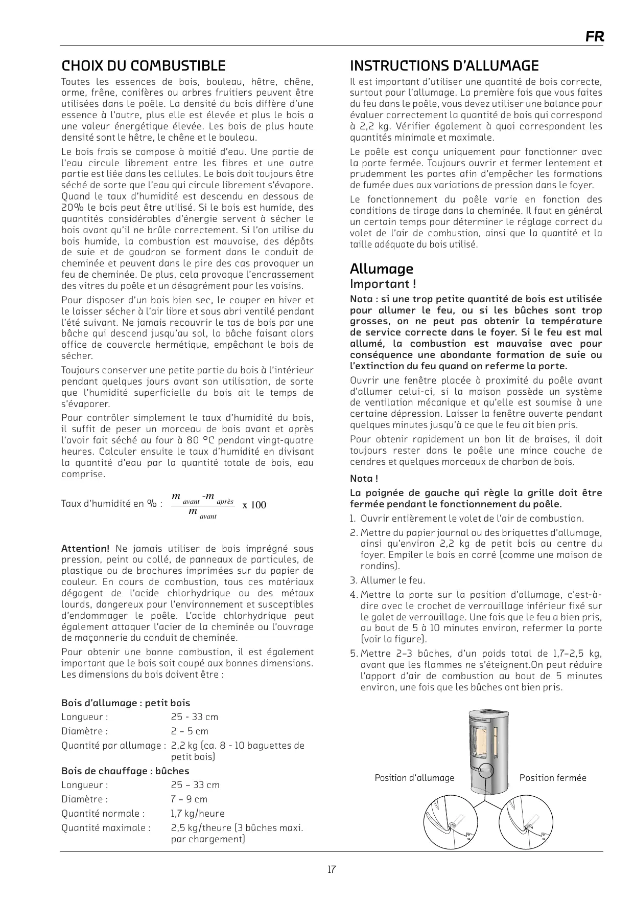 Diamètre : 2 – 5 cm Quantité par allumage : 2,2 kg (ca. 8 - 10 baguettes de petit bois) Bois de chauffage : bûches Longueur : 25 – 33 cm Diamètre : 7 – 9 cm Quantité normale : 1,7 kg/heure Quantité maximale : 2,5 kg/theure (3 bûches maxi. par chargement) Position d’allumage