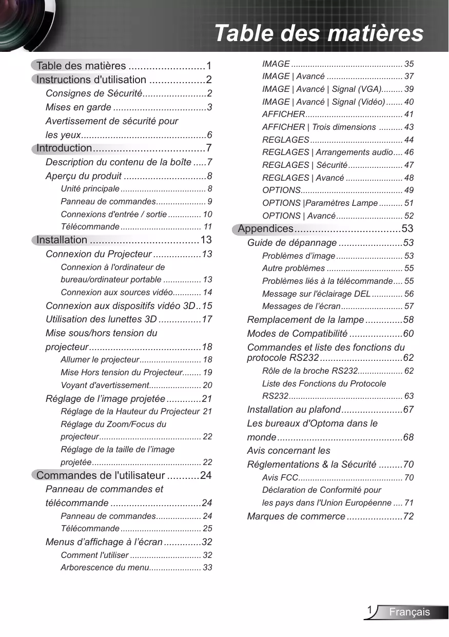 Remplacement de la lampe58 Modes de Compatibilité60 Commandes et liste des fonctions du protocole RS23262 Rôle de la broche RS232 62 Liste des Fonctions du Protocole RS232 63
