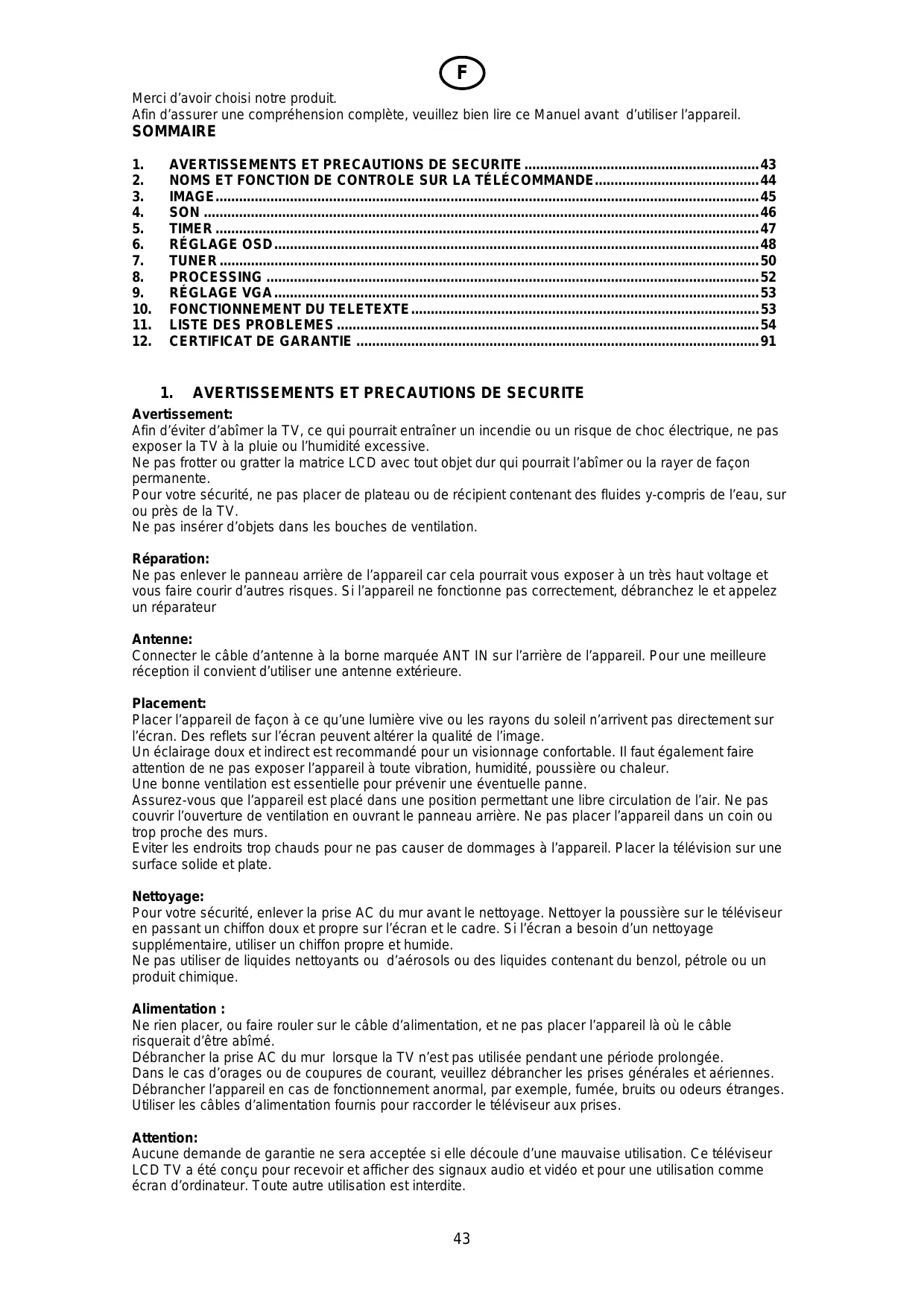 Afin d’éviter d’abîmer la TV, ce qui pourrait entraîner un incendie ou un risque de choc électrique, ne pas exposer la TV à la pluie ou l’humidité excessive. Ne pas frotter ou gratter la matrice LCD avec tout objet dur qui pourrait l’abîmer ou la rayer de façon permanente. Pour votre sécurité, ne pas placer de plateau ou de récipient contenant des fluides y-compris de l’eau, sur ou près de la TV. Ne pas insérer d’objets dans les bouches de ventilation. Réparation: Ne pas enlever le panneau arrière de l’appareil car cela pourrait vous exposer à un très haut voltage et vous faire courir d’autres risques. Si l’appareil ne fonctionne pas correctement, débranchez le et appelez un réparateur Antenne: Connecter le câble d’antenne à la borne marquée ANT IN sur l’arrière de l’appareil. Pour une meilleure réception il convient d’utiliser une antenne extérieure. Placement: Placer l’appareil de façon à ce qu’une lumière vive ou les rayons du soleil n’arrivent pas directement sur l’écran. Des reflets sur l’écran peuvent altérer la qualité de l’image. Un éclairage doux et indirect est recommandé pour un visionnage confortable. Il faut également faire attention de ne pas exposer l’appareil à toute vibration, humidité, poussière ou chaleur. Une bonne ventilation est essentielle pour prévenir une éventuelle panne. Assurez-vous que l’appareil est placé dans une position permettant une libre circulation de l’air. Ne pas couvrir l’ouverture de ventilation en ouvrant le panneau arrière. Ne pas placer l’appareil dans un coin ou trop proche des murs. Eviter les endroits trop chauds pour ne pas causer de dommages à l’appareil. Placer la télévision sur une surface solide et plate. Nettoyage: Pour votre sécurité, enlever la prise AC du mur avant le nettoyage. Nettoyer la poussière sur le téléviseur en passant un chiffon doux et propre sur l’écran et le cadre. Si l’écran a besoin d’un nettoyage supplémentaire, utiliser un chiffon propre et humide. Ne pas utiliser de liquides nettoyants ou d’aérosols ou des liquides contenant du benzol, pétrole ou un produit chimique. Alimentation : Ne rien placer, ou faire rouler sur le câble d’alimentation, et ne pas placer l’appareil là où le câble risquerait d’être abîmé. Débrancher la prise AC du mur lorsque la TV n’est pas utilisée pendant une période prolongée. Dans le cas d’orages ou de coupures de courant, veuillez débrancher les prises générales et aériennes. Débrancher l’appareil en cas de fonctionnement anormal, par exemple, fumée, bruits ou odeurs étranges. Utiliser les câbles d’alimentation fournis pour raccorder le téléviseur aux prises. Attention: Aucune demande de garantie ne sera acceptée si elle découle d’une mauvaise utilisation. Ce téléviseur LCD TV a été conçu pour recevoir et afficher des signaux audio et vidéo et pour une utilisation comme écran d’ordinateur. Toute autre utilisation est interdite.