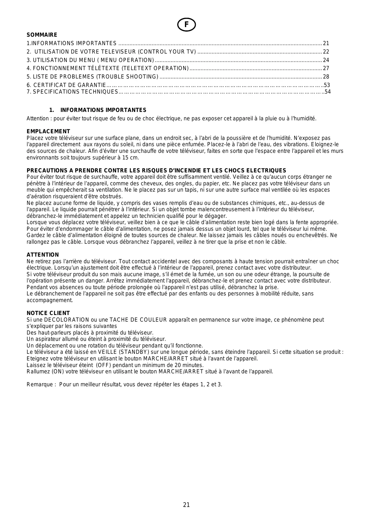 Attention : pour éviter tout risque de feu ou de choc électrique, ne pas exposer cet appareil à la pluie ou à l’humidité. EMPLACEMENT Placez votre téléviseur sur une surface plane, dans un endroit sec, à l’abri de la poussière et de l’humidité. N’exposez pas l’appareil directement aux rayons du soleil, ni dans une pièce enfumée. Placez-le à l’abri de l’eau, des vibrations. Eloignez-le des sources de chaleur. Afin d’éviter une surchauffe de votre téléviseur, faites en sorte que l’espace entre l’appareil et les murs environnants soit toujours supérieur à 15 cm. PRECAUTIONS A PRENDRE CONTRE LES RISQUES D’INCENDIE ET LES CHOCS ELECTRIQUES Pour éviter tout risque de surchauffe, votre appareil doit être suffisamment ventilé. Veillez à ce qu’aucun corps étranger ne pénètre à l’intérieur de l’appareil, comme des cheveux, des ongles, du papier, etc. Ne placez pas votre téléviseur dans un meuble qui empêcherait sa ventilation. Ne le placez pas sur un tapis, ni sur une autre surface mal ventilée où les espaces d’aération risqueraient d’être obstrués. Ne placez aucune forme de liquide, y compris des vases remplis d’eau ou de substances chimiques, etc., au-dessus de l’appareil. Le liquide pourrait pénétrer à l’intérieur. Si un objet tombe malencontreusement à l’intérieur du téléviseur, débranchez-le immédiatement et appelez un technicien qualifié pour le dégager. Lorsque vous déplacez votre téléviseur, veillez bien à ce que le câble d’alimentation reste bien logé dans la fente appropriée. Pour éviter d’endommager le câble d’alimentation, ne posez jamais dessus un objet lourd, tel que le téléviseur lui même. Gardez le câble d’alimentation éloigné de toutes sources de chaleur. Ne laissez jamais les câbles noués ou enchevêtrés. Ne rallongez pas le câble. Lorsque vous débranchez l’appareil, veillez à ne tirer que la prise et non le câble. ATTENTION Ne retirez pas l’arrière du téléviseur. Tout contact accidentel avec des composants à haute tension pourrait entraîner un choc électrique. Lorsqu’un ajustement doit être effectué à l’intérieur de l’appareil, prenez contact avec votre distributeur. Si votre téléviseur produit du son mais aucune image, s’il émet de la fumée, un son ou une odeur étrange, la poursuite de l’opération présente un danger. Arrêtez immédiatement l’appareil, débranchez-le et prenez contact avec votre distributeur. Pendant vos absences ou toute période prolongée où l’appareil n’est pas utilisé, débranchez la prise. Le débranchement de l’appareil ne soit pas être effectué par des enfants ou des personnes à mobilité réduite, sans accompagnement. NOTICE CLIENT Si une DECOLORATION ou une TACHE DE COULEUR apparaît en permanence sur votre image, ce phénomène peut s’expliquer par les raisons suivantes Des haut-parleurs placés à proximité du téléviseur. Un aspirateur allumé ou éteint à proximité du téléviseur. Un déplacement ou une rotation du téléviseur pendant qu’il fonctionne. Le téléviseur a été laissé en VEILLE (STANDBY) sur une longue période, sans éteindre l’appareil. Si cette situation se produit : Eteignez votre téléviseur en utilisant le bouton MARCHE/ARRET situé à l’avant de l’appareil. Laissez le téléviseur éteint (OFF) pendant un minimum de 20 minutes. Rallumez (ON) votre téléviseur en utilisant le bouton MARCHE/ARRET situé à l’avant de l’appareil. Remarque : Pour un meilleur résultat, vous devez répéter les étapes 1, 2 et 3.
