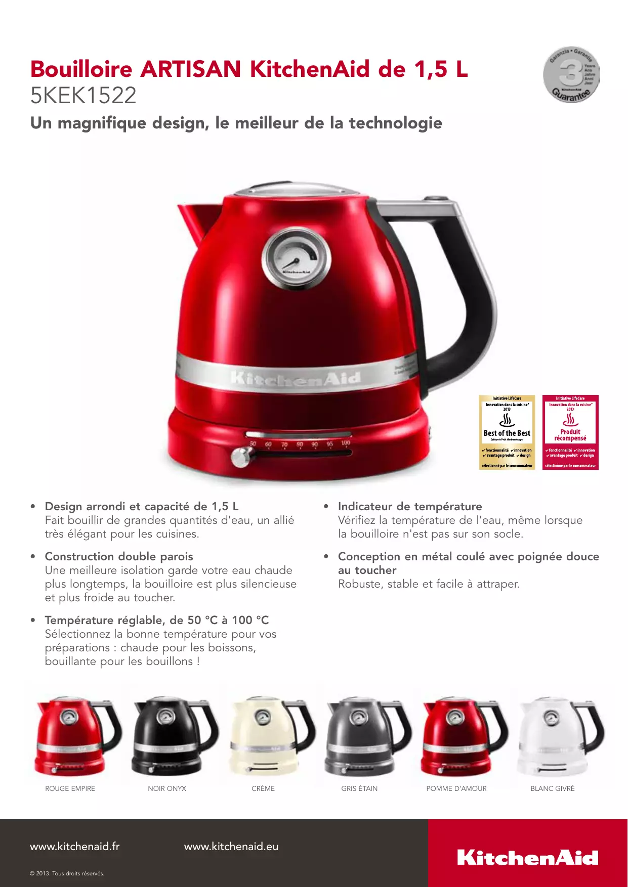 - Température réglable, de 50 °C à 100 °C Sélectionnez la bonne température pour vos préparations : chaude pour les boissons, bouillante pour les bouillons ! ROUGE EMPIRE www.kitchenaid.fr © 2013. Tous droits réservés. NOIR ONYX CRÈME www.kitchenaid.eu GRIS ÉTAIN