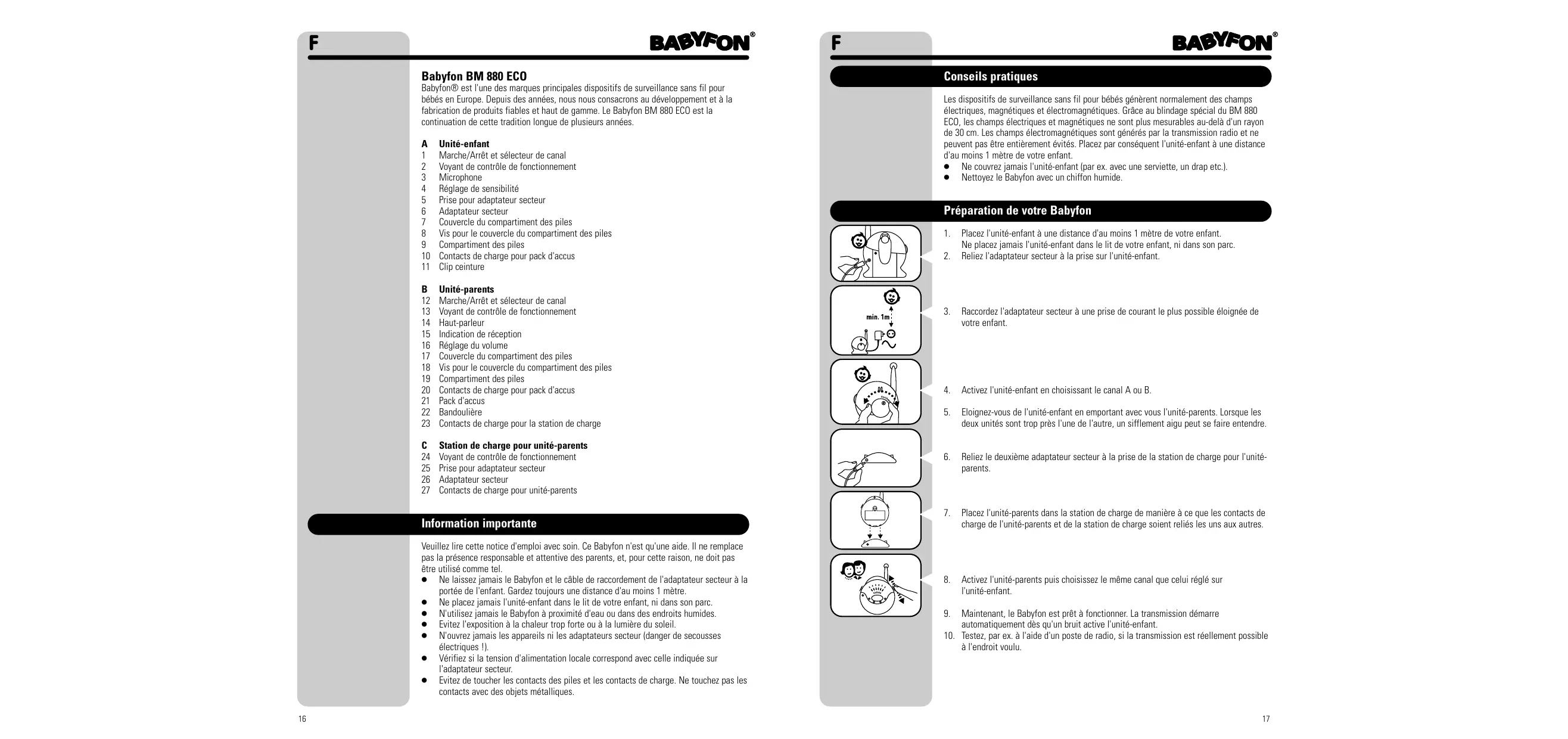 Babyfon® est l'une des marques principales dispositifs de surveillance sans fil pour bébés en Europe. Depuis des années, nous nous consacrons au développement et à la fabrication de produits fiables et haut de gamme. Le Babyfon BM 880 ECO est la continuation de cette tradition longue de plusieurs années. Information importante Veuillez lire cette notice d'emploi avec soin. Ce Babyfon n'est qu'une aide. Il ne remplace pas la présence responsable et attentive des parents, et, pour cette raison, ne doit pas être utilisé comme tel. ● Ne laissez jamais le Babyfon et le câble de raccordement de l'adaptateur secteur à la portée de l'enfant. Gardez toujours une distance d'au moins 1 mètre. ● Ne placez jamais l'unité-enfant dans le lit de votre enfant, ni dans son parc. ● N'utilisez jamais le Babyfon à proximité d'eau ou dans des endroits humides. ● Evitez l'exposition à la chaleur trop forte ou à la lumière du soleil. ● N'ouvrez jamais les appareils ni les adaptateurs secteur (danger de secousses électriques !). ● Vérifiez si la tension d'alimentation locale correspond avec celle indiquée sur l'adaptateur secteur. ● Evitez de toucher les contacts des piles et les contacts de charge. Ne touchez pas les contacts avec des objets métalliques.