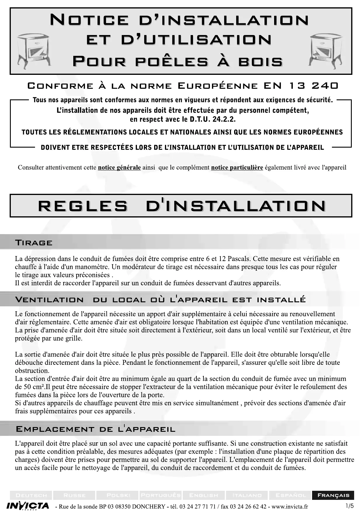 | Norme de conformité | Norme Européenne EN 13240 |