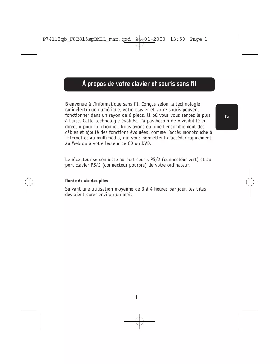 À propos du clavier et de la souris sans fil Bienvenue dans le monde de l’informatique sans fil. Élaborés à partir d’une technologie radio numérique, le clavier et la souris ont été conçus pour fonctionner à l’endroit où vous serez le plus à l’aise dans un périmètre de 1,80 mètre. Cette technologie évoluée ne nécessite pas un fonctionnement en contact visuel direct. Nous avons éliminé l’enchevêtrement de câbles et ajouté des fonctionnalités évoluées, telles que l’accès une touche à Internet et des touches multimédia qui vous permettront d’accéder rapidement au Web ou à vos CD/DVD. Le récepteur se raccorde au port souris PS/2 (conducteur vert) et au port clavier PS/2 (connecteur violet) de l’ordinateur. Durée de vie des piles Avec une utilisation moyenne de 3 à 4 heures par jour, les piles devraient durer environ un mois.