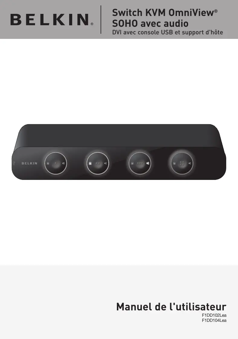 Introduction section Félicitations et merci d'avoir fait l'achat de ce switch KVM OmniView SOHO avec audio de Belkin. Ce switch KVM vous permet de partager un moniteur DVI-D ainsi qu'un clavier et une souris avec un maximum de quatre ordinateurs. Conçu pour économiser l'espace, le switch KVM se place sur votre bureau pour un encombrement minimal. Il permet d'éviter l'achat de périphériques supplémentaires, tout en vous offrant des fonctions pratiques et simples d'utilisation. Pour en savoir plus sur l'installation et le fonctionnement du switch KVM, veuillez lire le présent Manuel de l'utilisateur. Le Guide d'installation rapide inclus avec le produit propose également des instructions d'installation et de mise en route rapide. Veuillez prendre connaissance de ces documents afin de tirer pleinement profit des fonctions de votre nouveau switch KVM. Contenu du coffret OmniView Switch KVM SOHO avec audio Bloc d'alimentation Adaptateur CC 9 V, 1,1 A Livré avec fiche pour le Royaume-Uni et Manuel de l'utilisateur Guide d'installation rapide 2/4 Kits de câbles DVI/USB/audio SOHO, 1,8 m