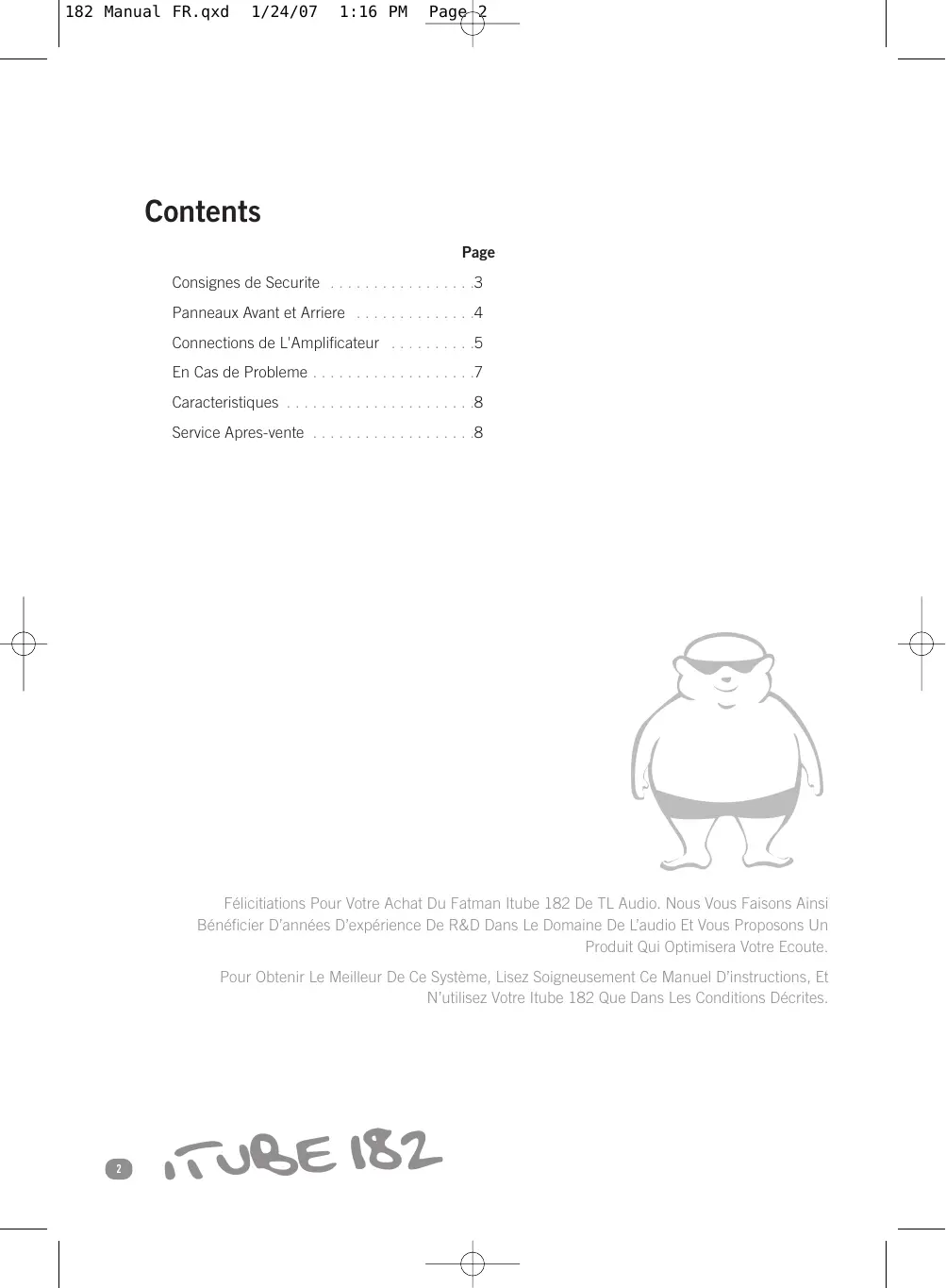 - Service Apres-vente Félicitiations Pour Votre Achat Du Fatman Itube 182 De TL Audio. Nous Vous Faisons Ainsi Bénéficier D’années D’expérience De R&D Dans Le Domaine De L’audio Et Vous Proposons Un Produit Qui Optimisera Votre Ecoute. Pour Obtenir Le Meilleur De Ce Système, Lisez Soigneusement Ce Manuel D’instructions, Et N’utilisez Votre Itube 182 Que Dans Les Conditions Décrites. p. 8