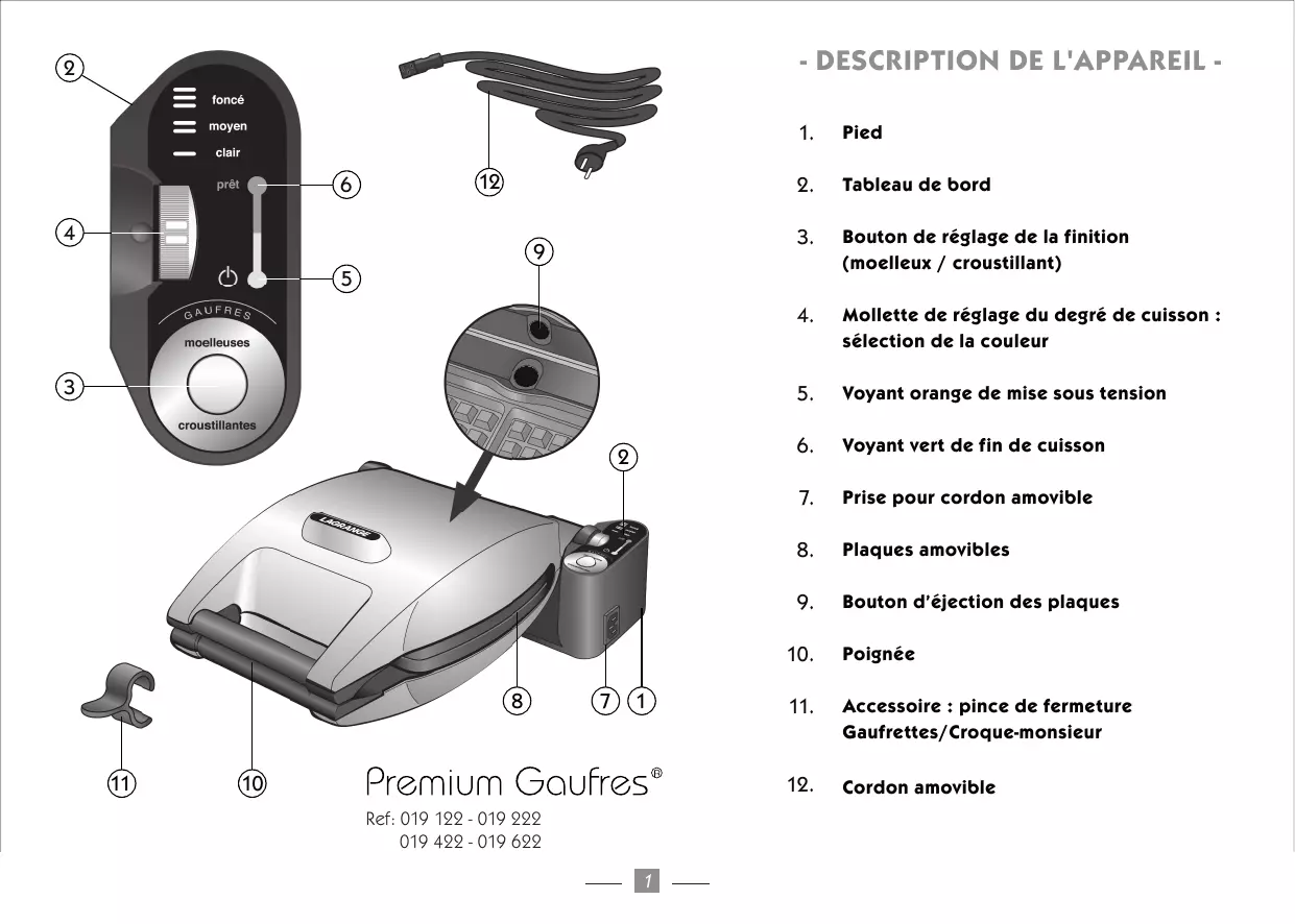 - Bouton de réglage de la finition (moelleux / croustillant) Réf 010122 : plaques maxi gaufres (5x8) Réf. 010222 : plaques gaufrettes Réf. 010422 : plaques croque-monsieur